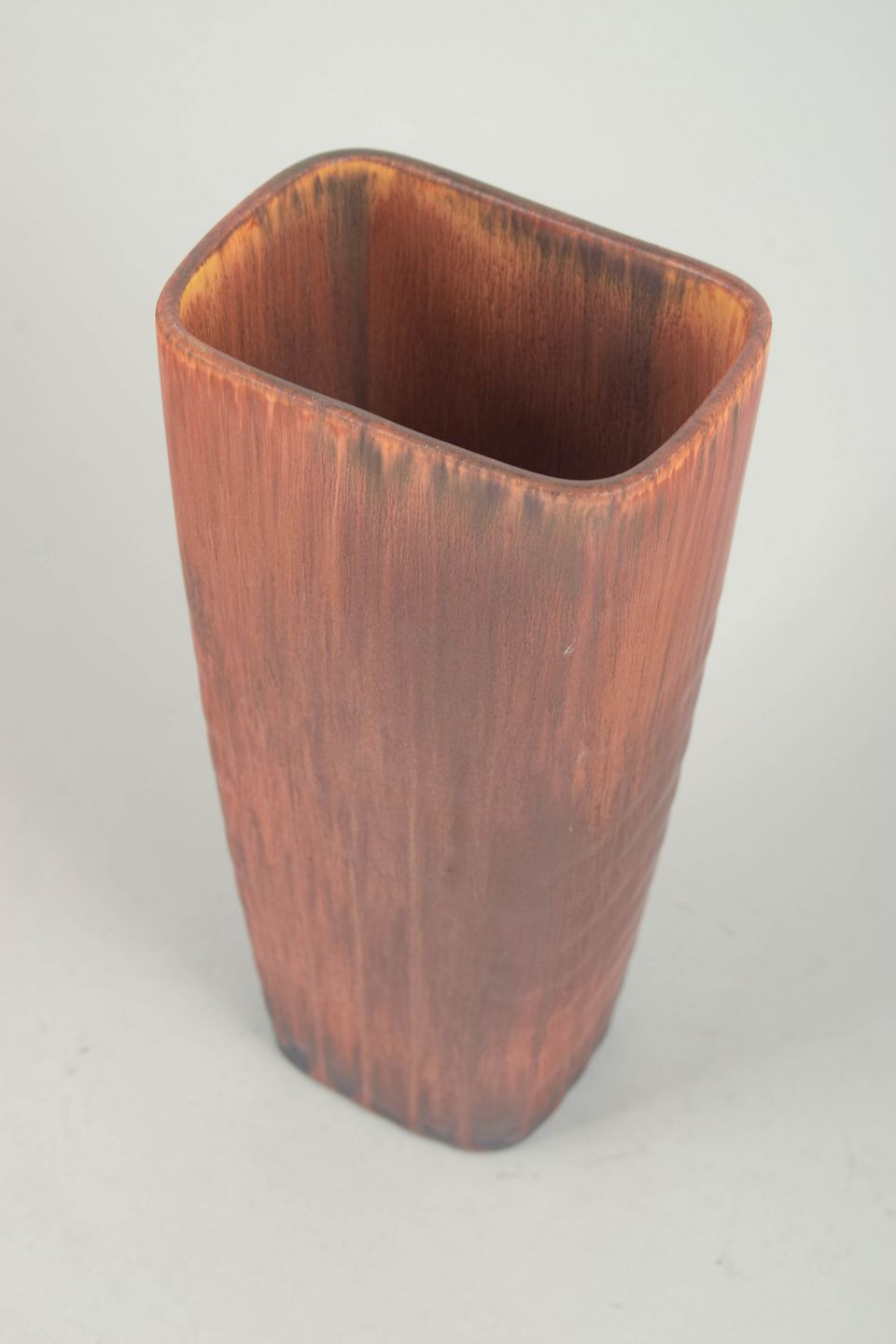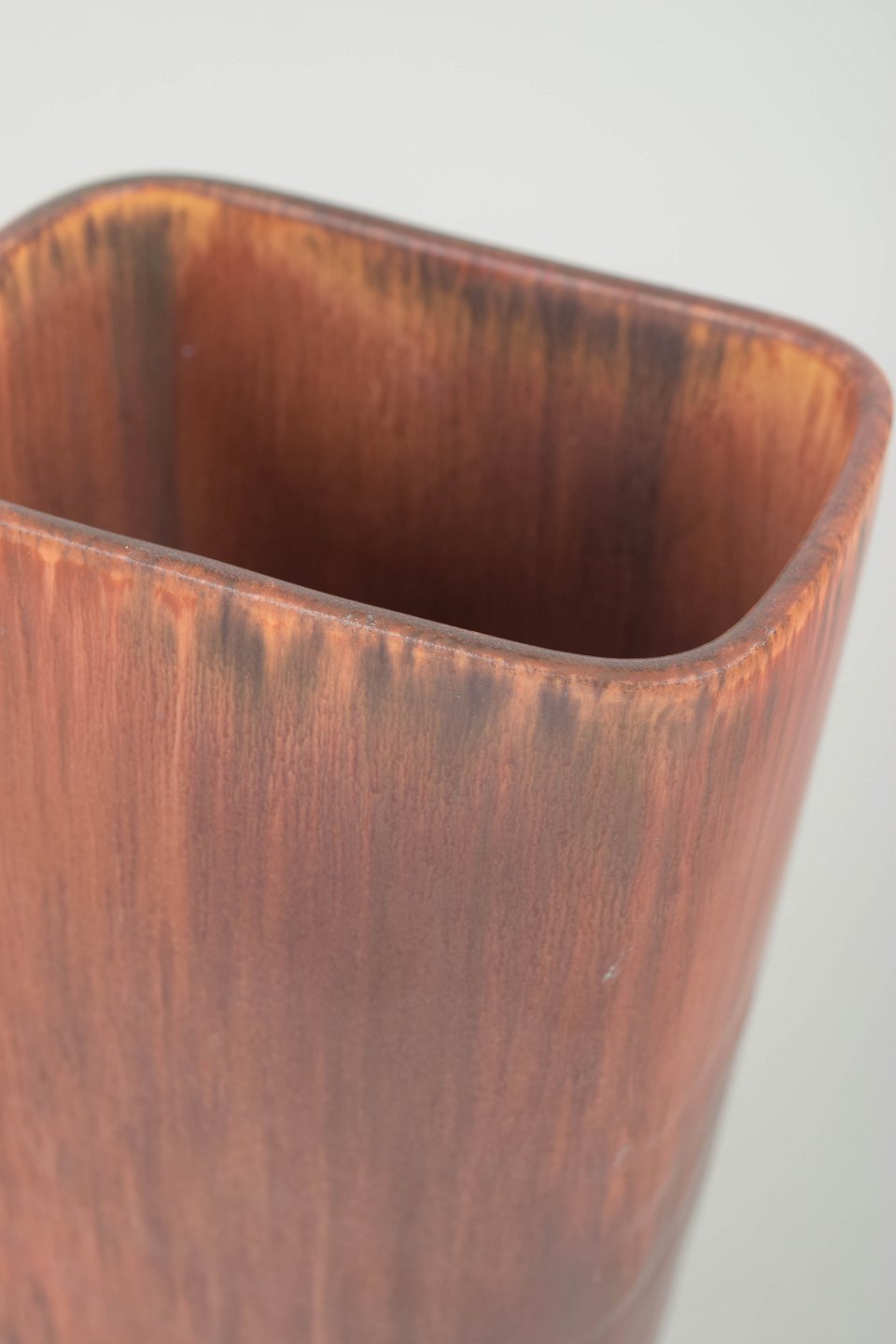 Large angular stoneware vase with a distinctive rectangular form and softly rounded corners. Decorated with flowing glaze in warm brown and copper tones, deepening into darker hues toward the base. A bold and decorative example of Stålhane’s work in larger formats.