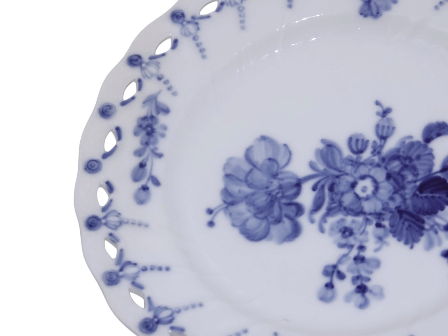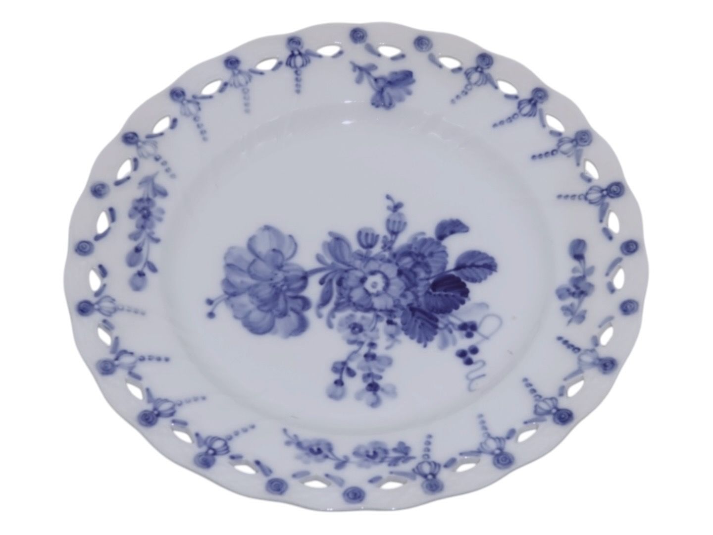 Royal Copenhagen Blå Blomst Svejfet, rund tallerken med helblonde kant. Den kan også bruges som underfad til frugtkurv nummer 10/1575.Af fabriksmærket kan det udledes, at denne er produceret mellem 1898 og 1923.