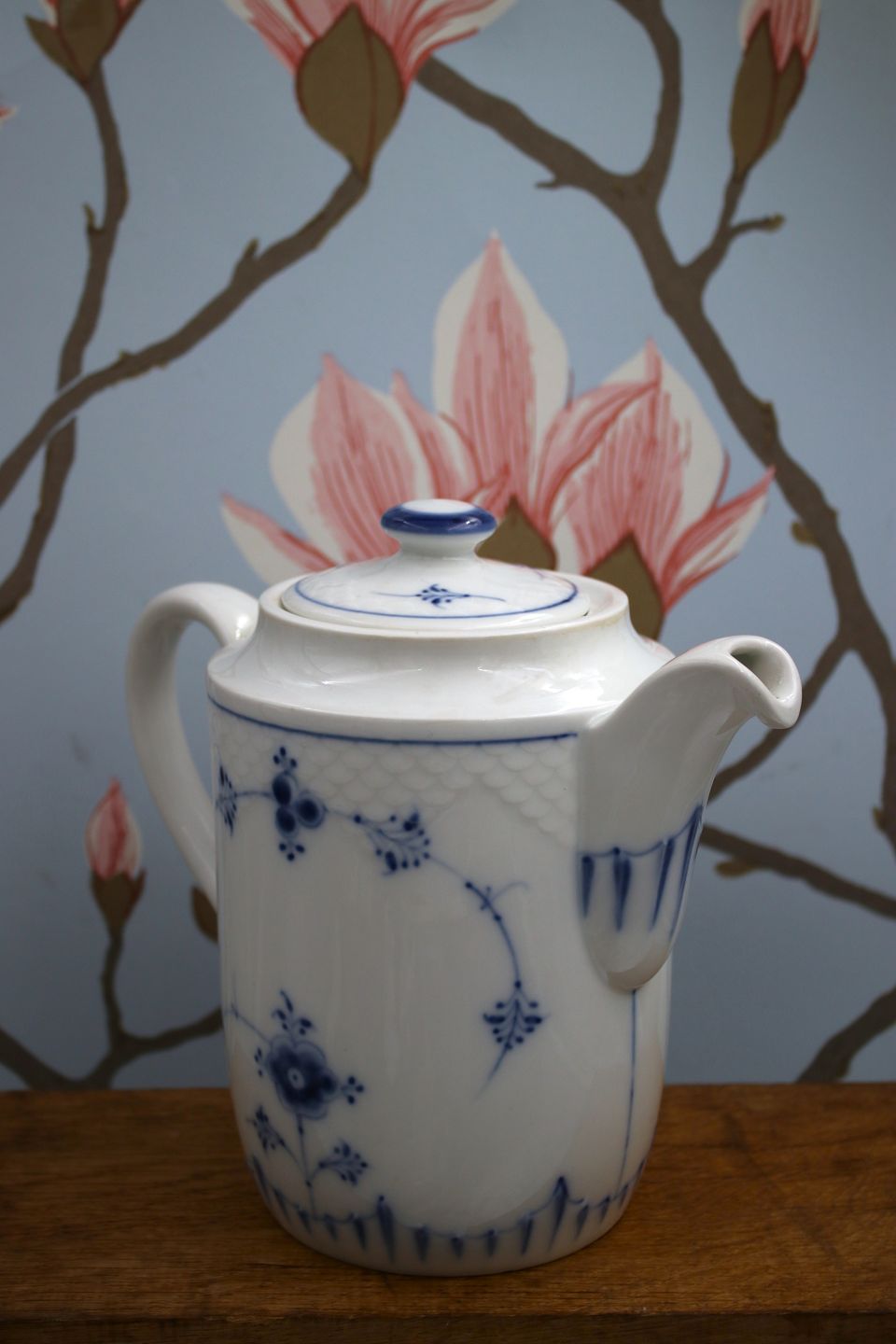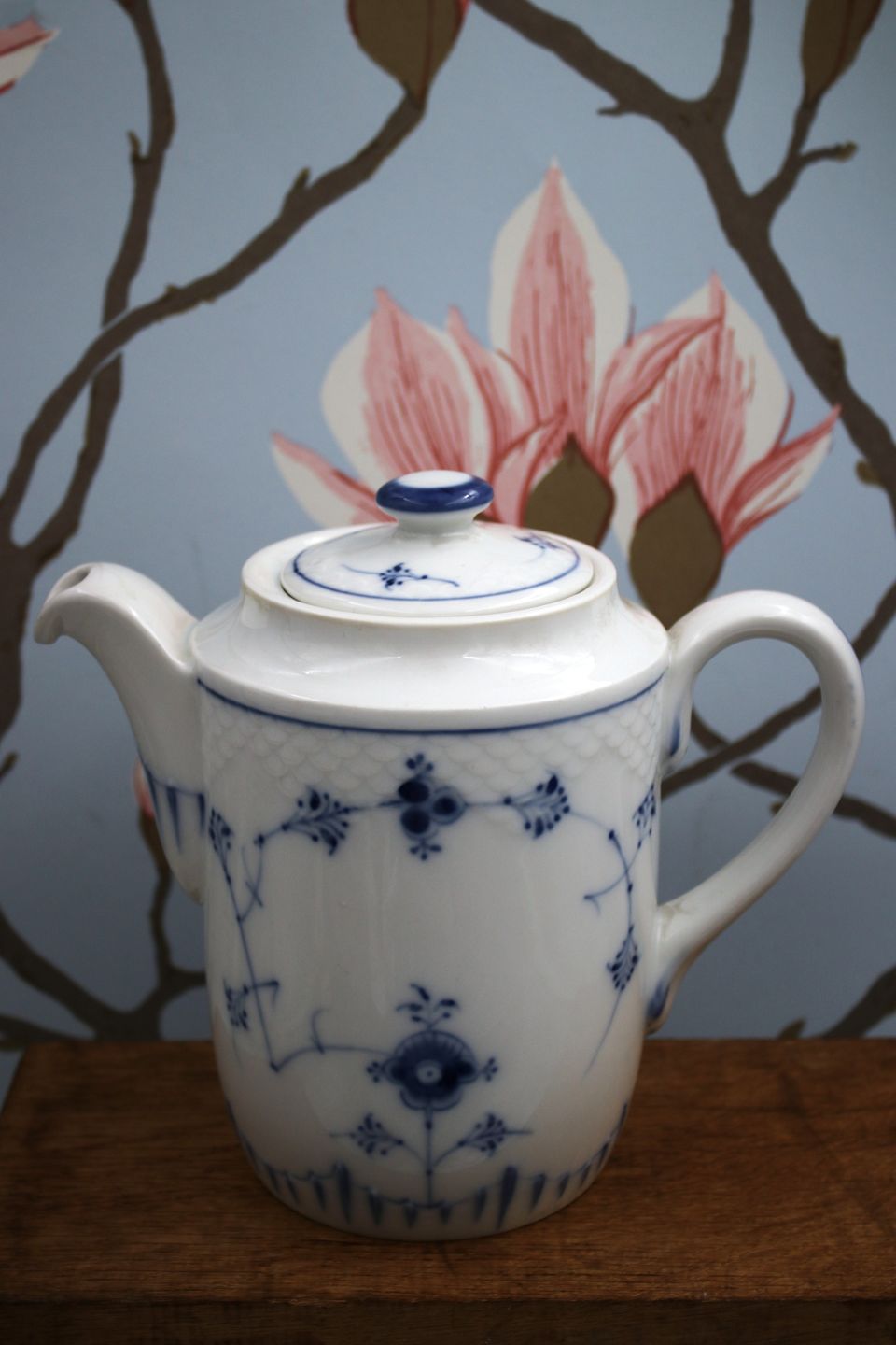 Bing & Grondahl coffee pot in Blue Fluted / Blue Fluted. Height: 19cm. Dia.: 13cm. Is in fine condition.Item number: B&G Blåmalet kaffekande H:19cm