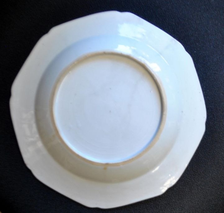 Chinese blue/white plate, 18th century. Chien-Lung. 8-sided. Hand-painted decorations of landscapes and flowers. Dia.: 22 cm.Perfect condition!
