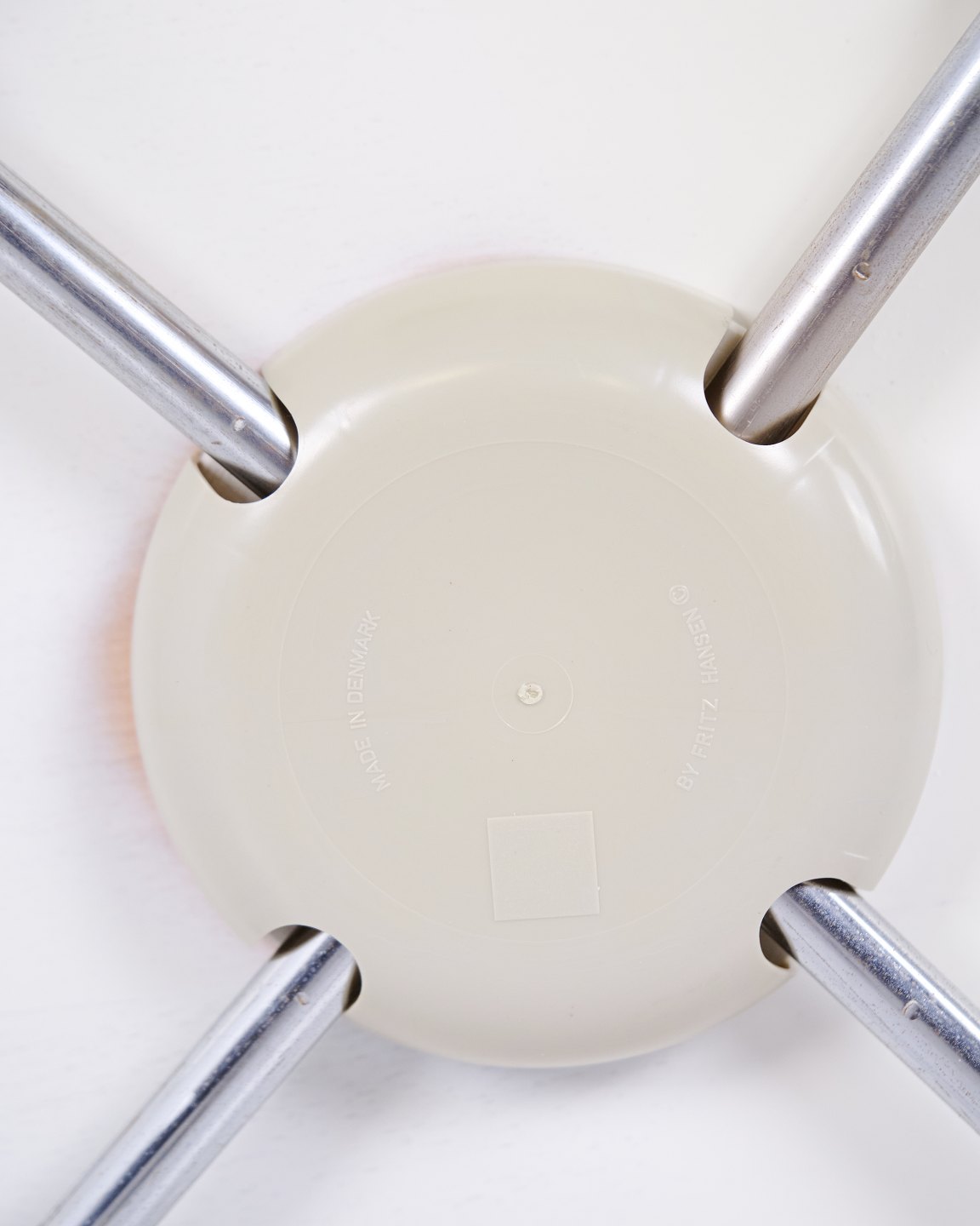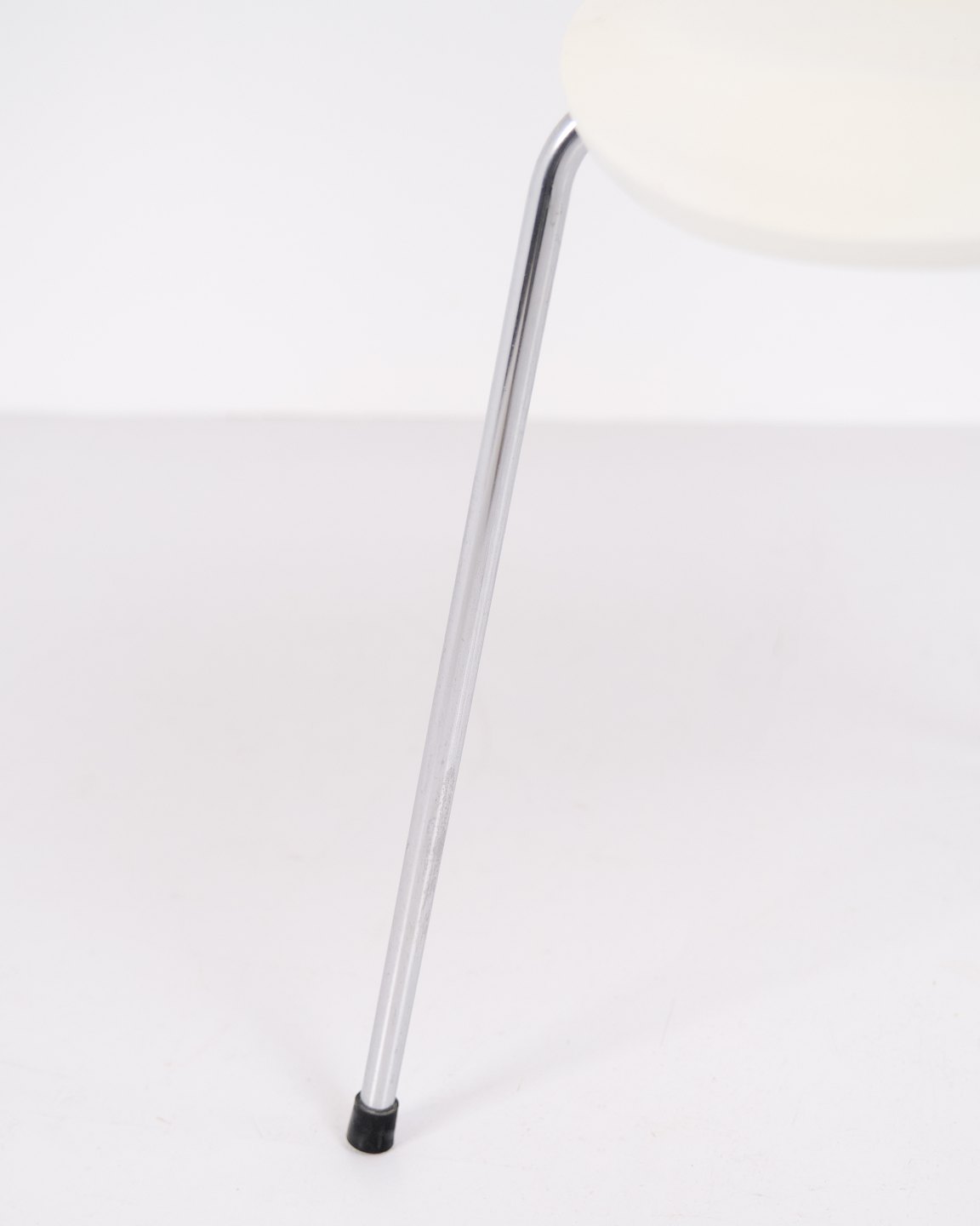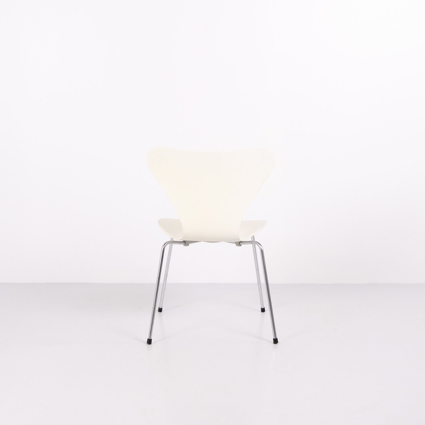 Set of 6 Series 7 chairs model 3107 designed by Arne Jacobsen for Fritz Hansen. The model was introduced in 1955 as a further development of the Ant chair from 1952. Crafted in pressure-moulded veneer with white lacquered finish and chrome-plated tubular steel frame. The distinctive seven-shaped silhouette made the model one of the most produced chairs in Danish design history. Model 3107 has been used in private homes, restaurants, offices and public interiors worldwide and is still produced by Fritz Hansen. Sold only as a complete set.