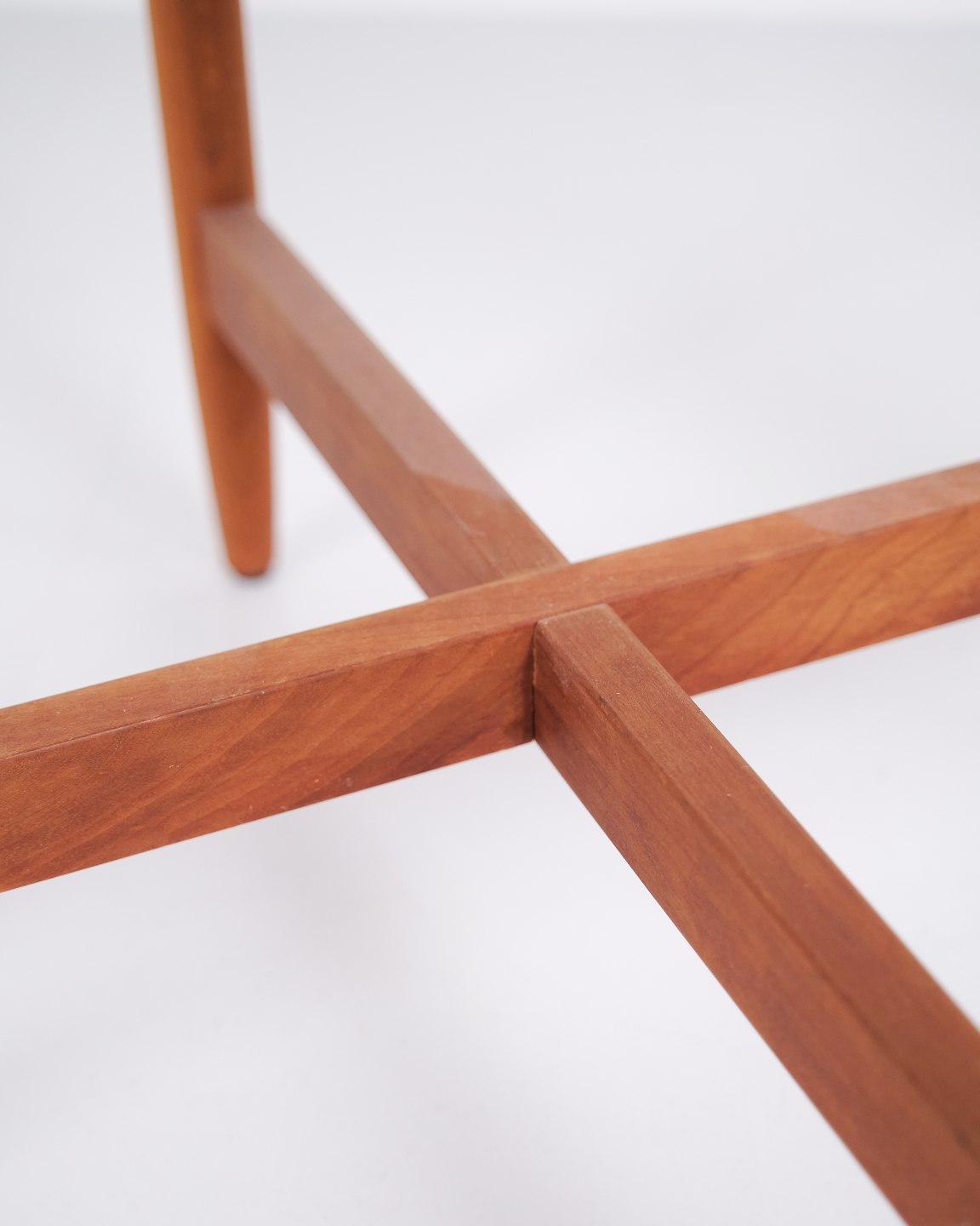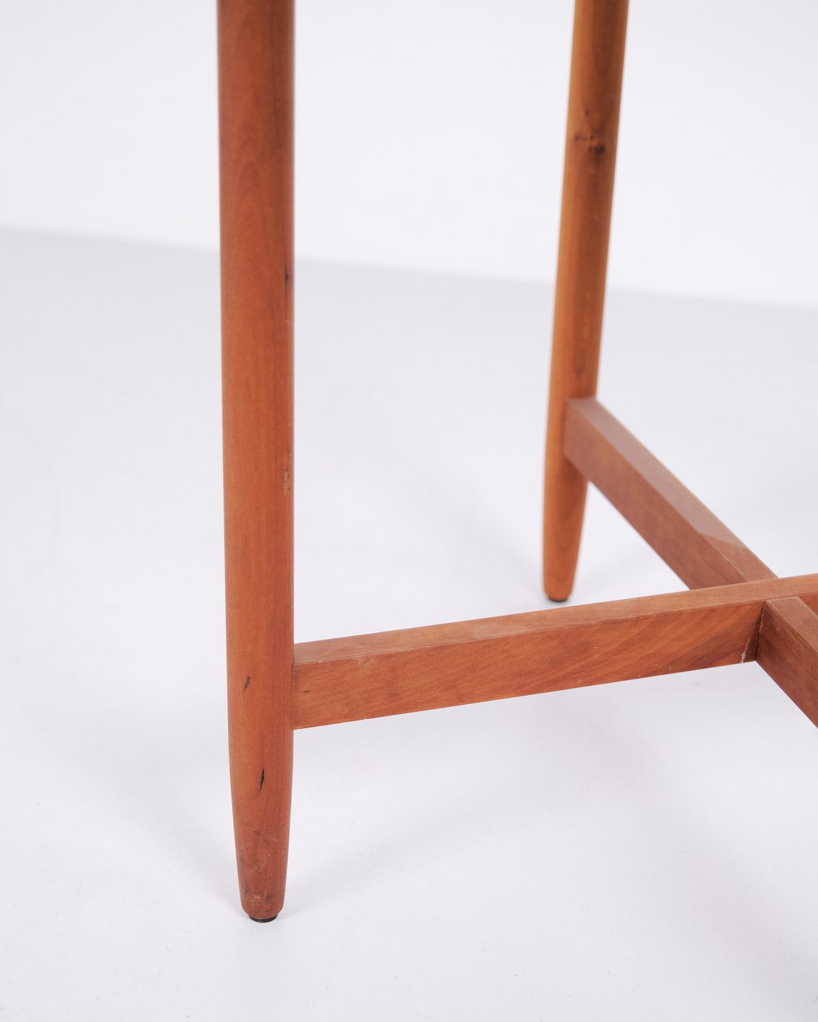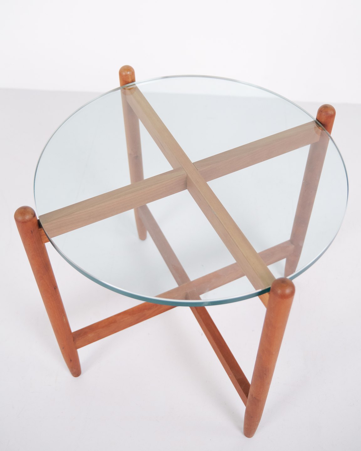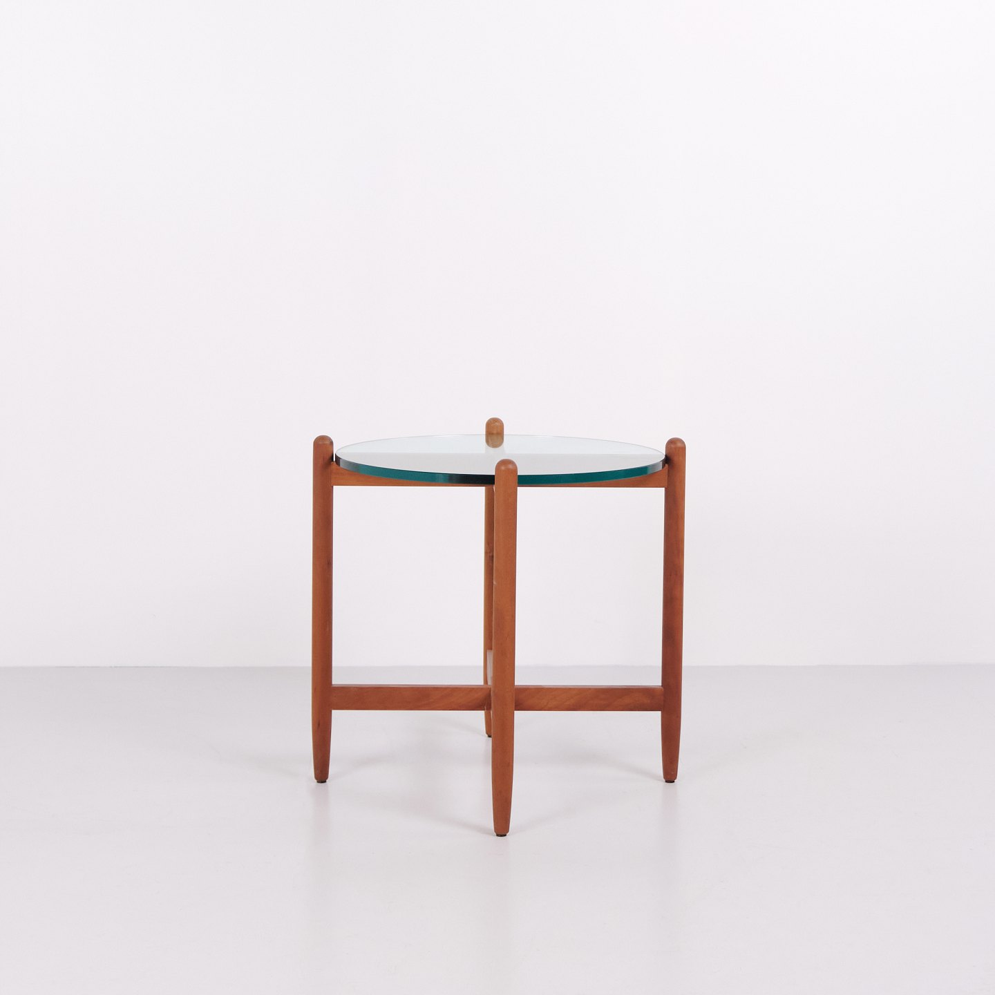 Swedish side table from the 1960s crafted in cherry wood with round glass top. The table features an organic base with softly curved legs and well-crafted joinery, inspired by the design language of Hans Johansson. The combination of solid wood and floating glass top is characteristic of Scandinavian design from the period. Suitable as a lamp table, sofa table or occasional table.— Origin: Sweden