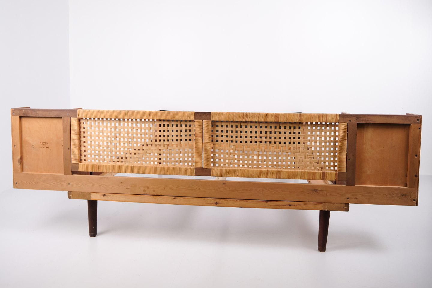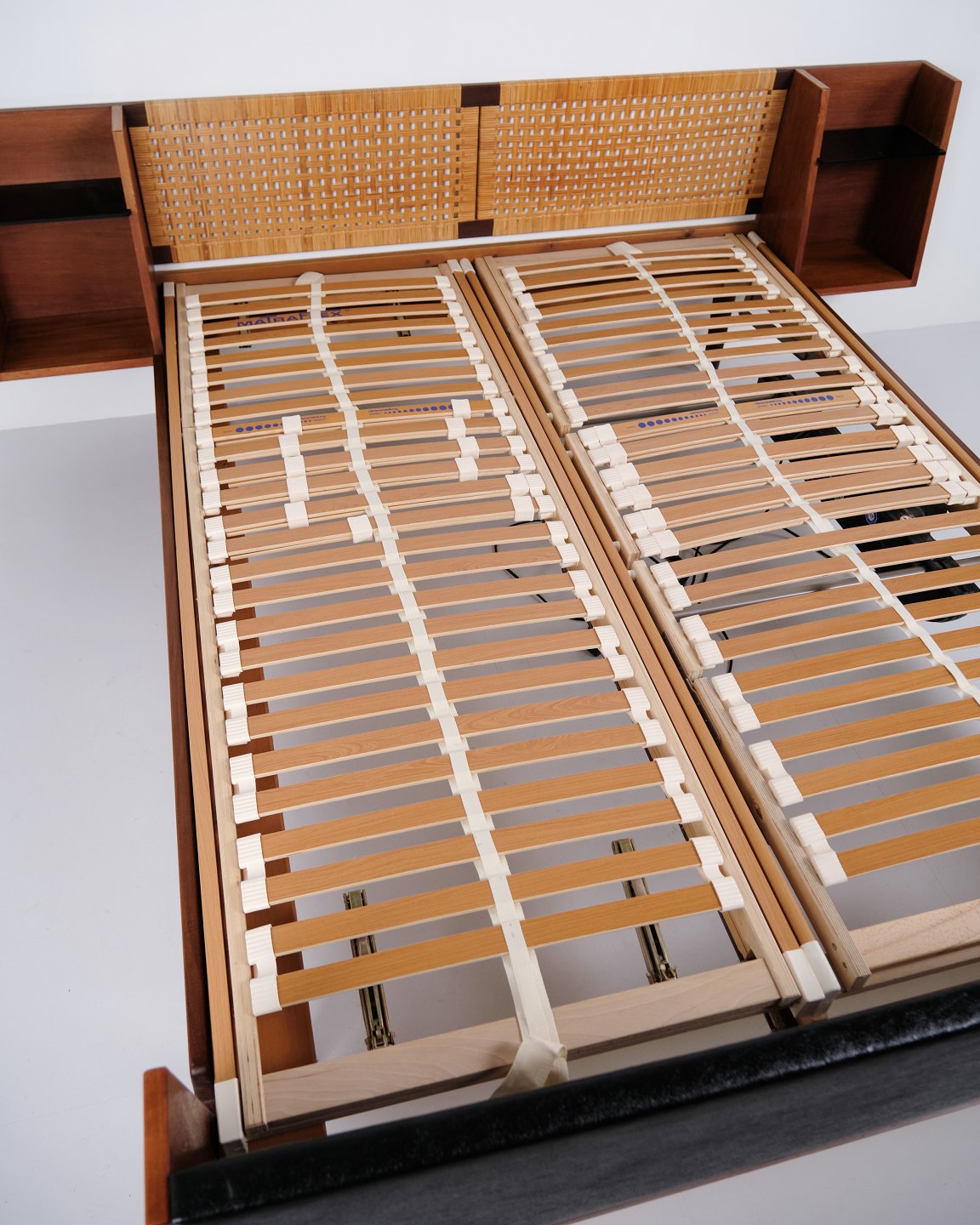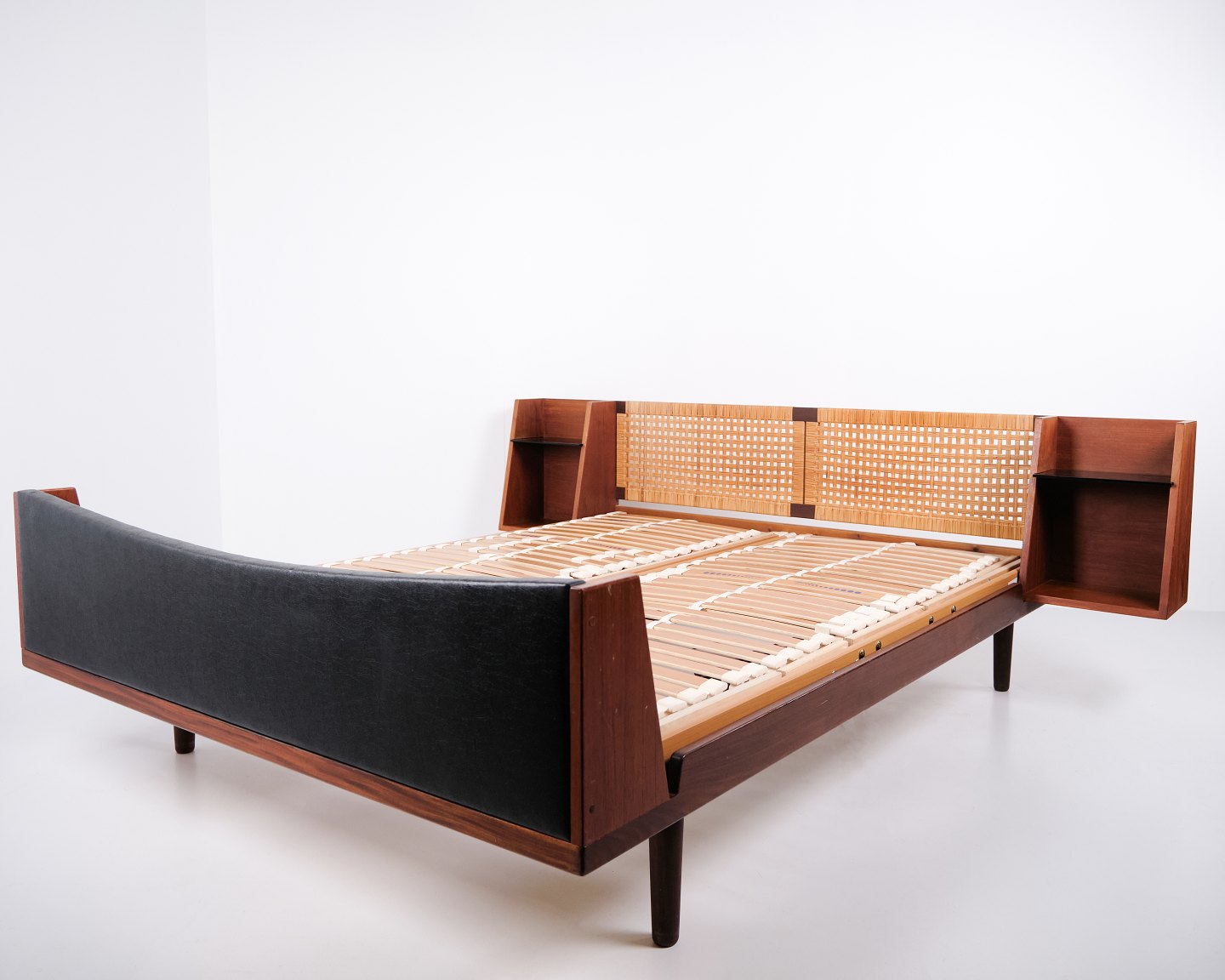 Model GE 701 double bed designed by Hans J. Wegner and manufactured by Getama in the 1950s. Crafted in veneered and solid teak. Headboard and footboard with cane weaving and black faux leather. Headboard with integrated bedside tables featuring black glass shelves and lower shelf. Brass fittings. Hans J. Wegner collaborated with Getama for many years and designed several teak furniture models for home interiors and bedrooms.— Origin: Denmark