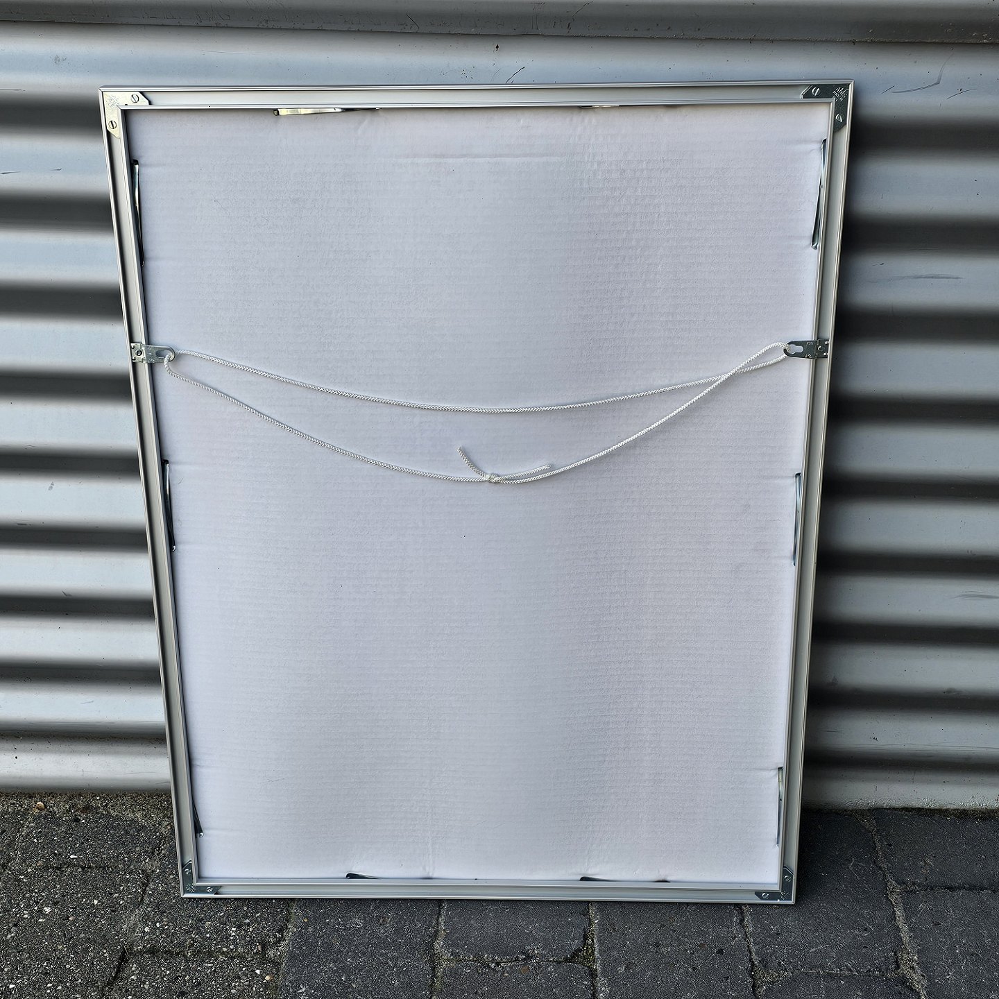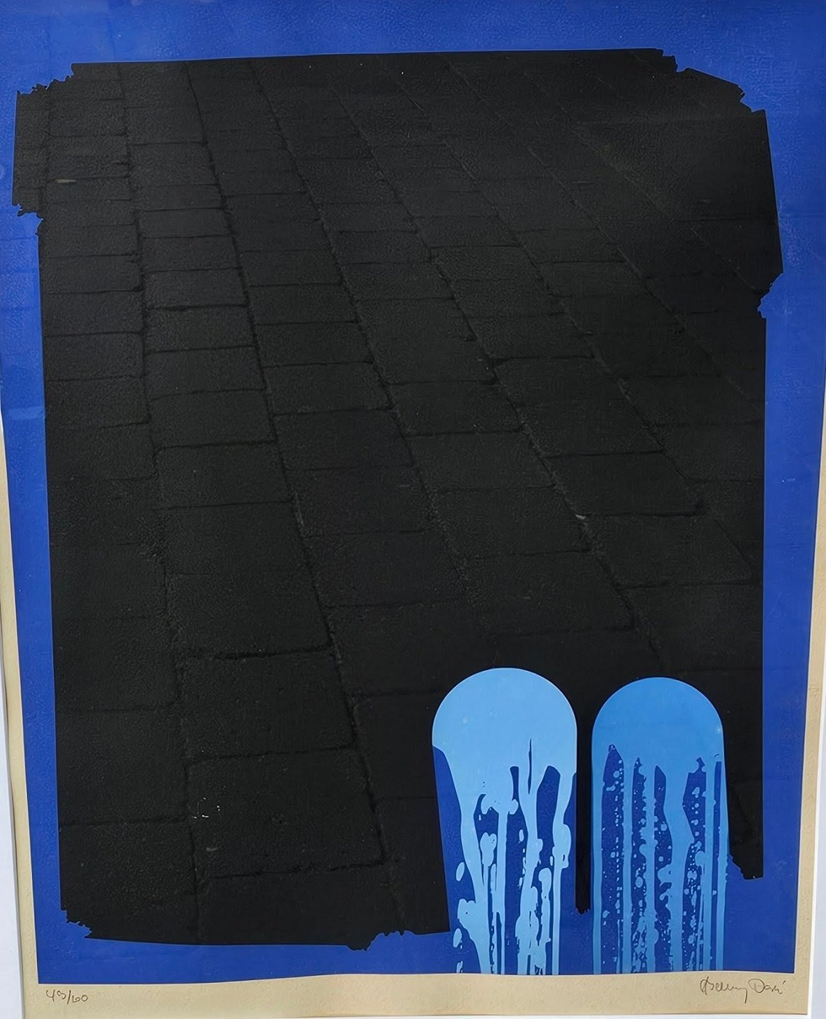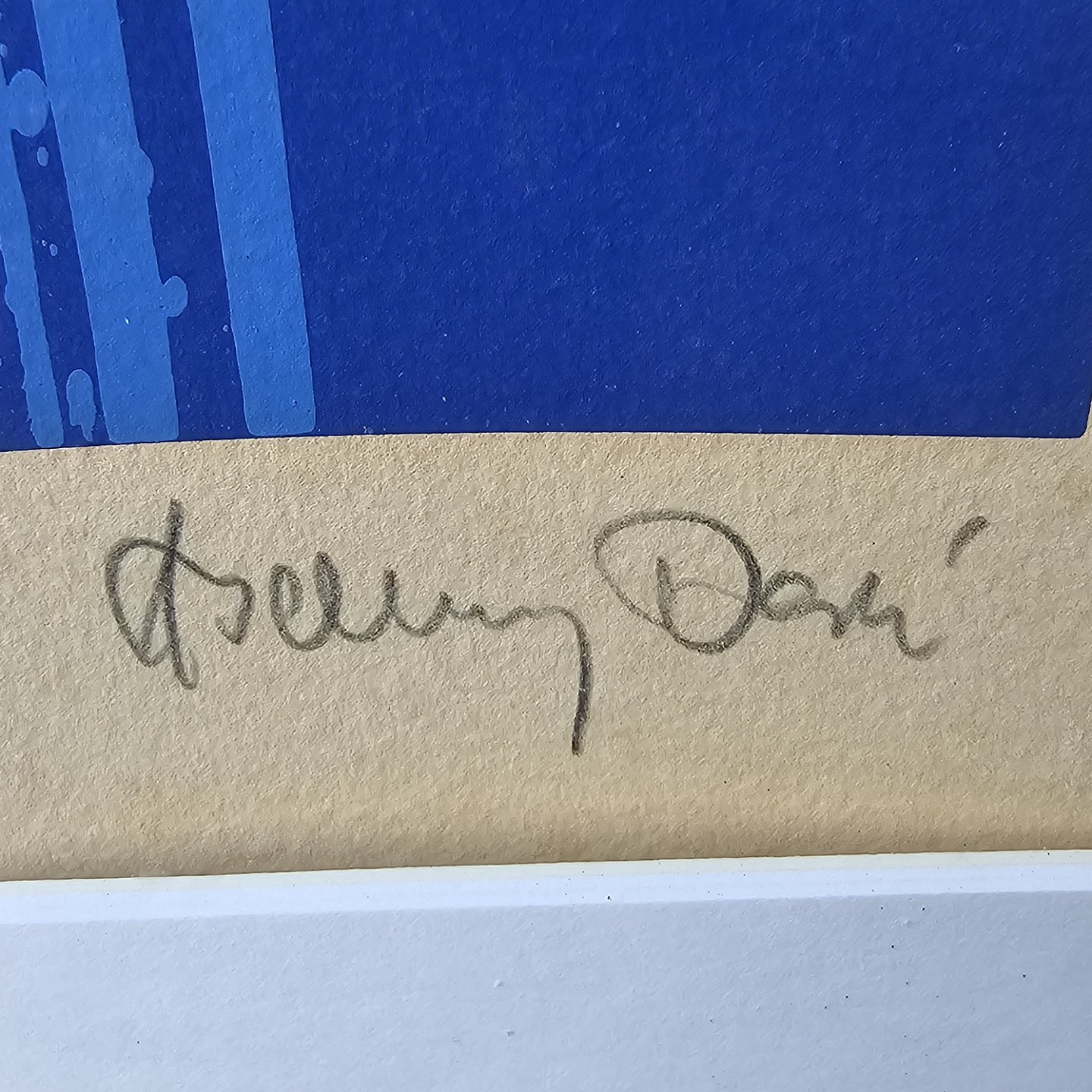 Litografi med abstrakt motiv i sort og blå monteret i sølvrammeKunstner Benny Dorè (født 1948), signeret