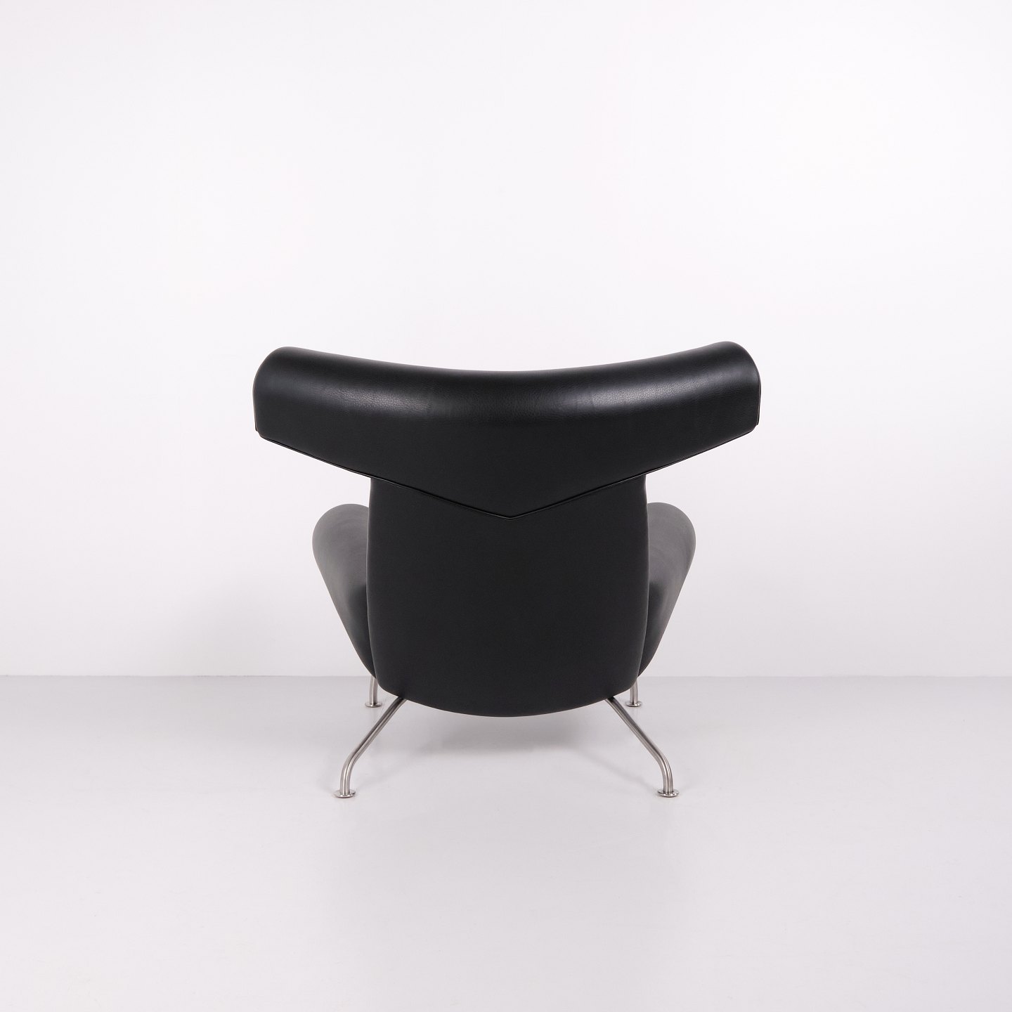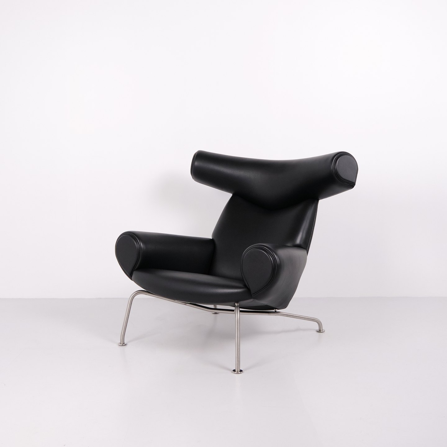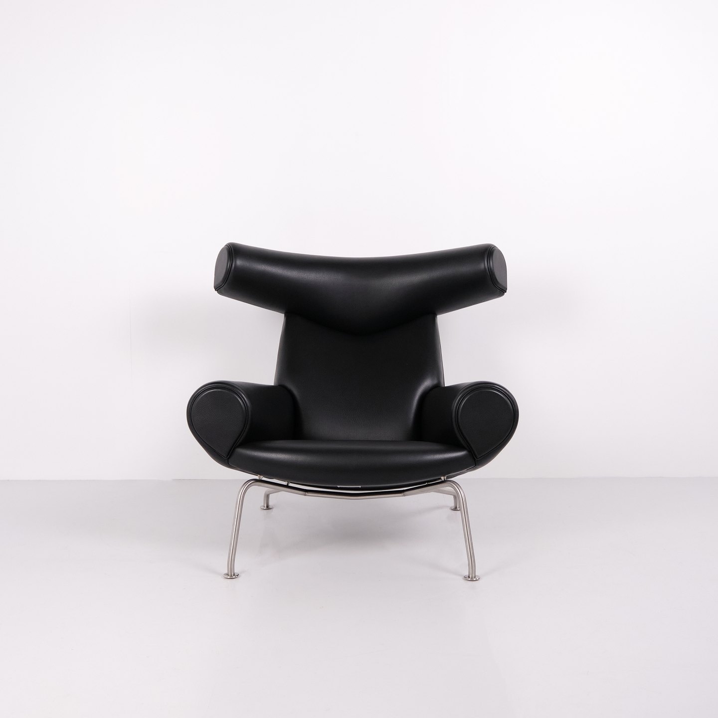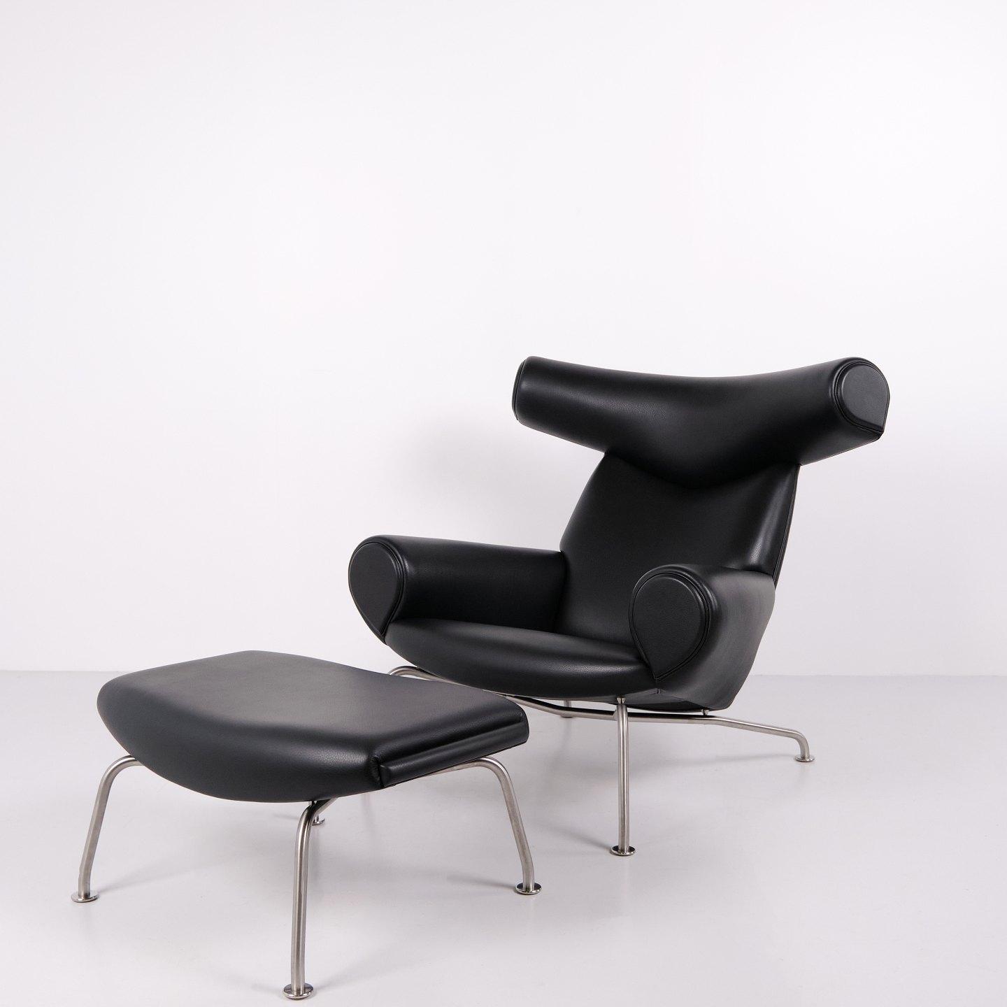 Ox Chair model EJ100 with matching ottoman designed by Hans J. Wegner. The model was designed in 1960 and is produced today by Fredericia Furniture following the acquisition of Erik Jørgensen. Upholstered in black leather with steel frame. The distinctive backrest with “horns” gave the chair its name Ox Chair. The design is considered one of Wegner’s most sculptural works and differs from many of his other chairs through its bold and organic form. The Ox Chair is represented in international collections and is among the most recognized Danish lounge chairs of the period.— Origin: Denmark