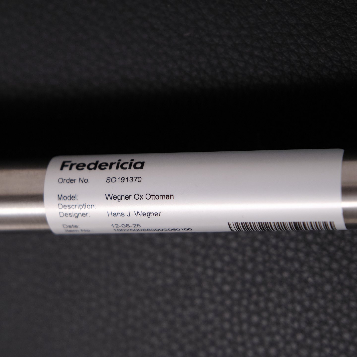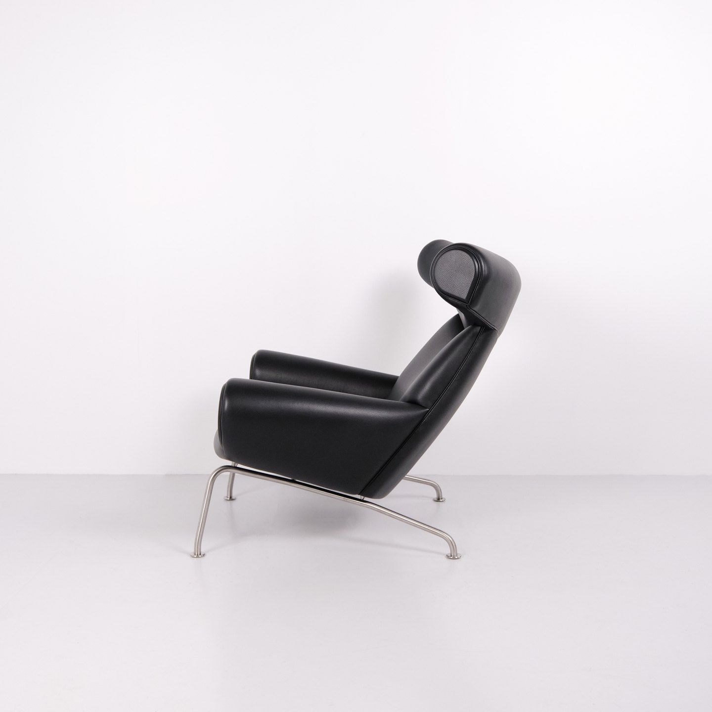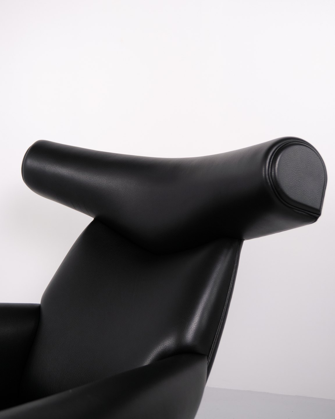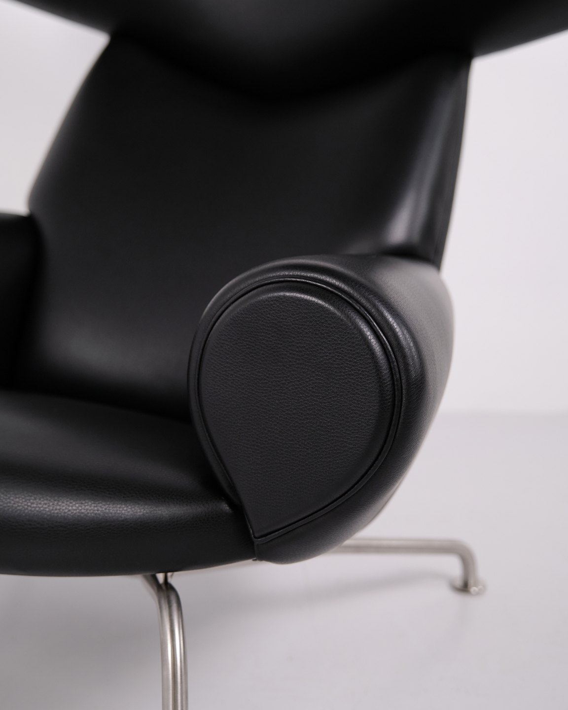 Ox Chair model EJ100 with matching ottoman designed by Hans J. Wegner. The model was designed in 1960 and is produced today by Fredericia Furniture following the acquisition of Erik Jørgensen. Upholstered in black leather with steel frame. The distinctive backrest with “horns” gave the chair its name Ox Chair. The design is considered one of Wegner’s most sculptural works and differs from many of his other chairs through its bold and organic form. The Ox Chair is represented in international collections and is among the most recognized Danish lounge chairs of the period.— Origin: Denmark