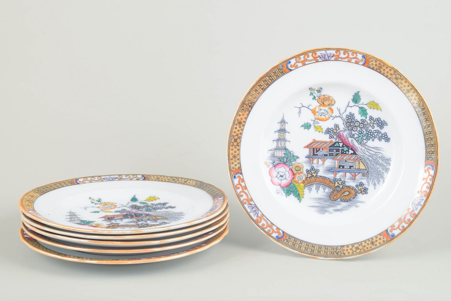 Rörstrand Japan series, set of six dinner plates.Dinner plates in faience with oriental-inspired decoration in polychrome colours and finely detailed painting in Japanese style, characteristic of Rörstrand’s japonisme production from the early 20th century.