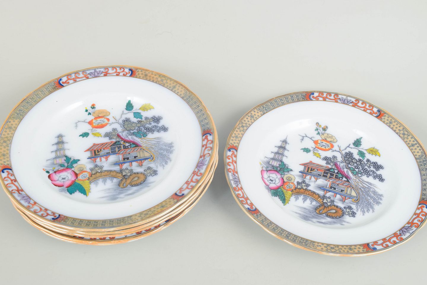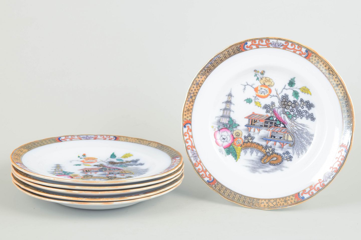 Rörstrand Japan series, set of six dinner plates.Dinner plates in faience with oriental-inspired decoration in polychrome colours and finely detailed painting in Japanese style, characteristic of Rörstrand’s japonisme production from the early 20th century.