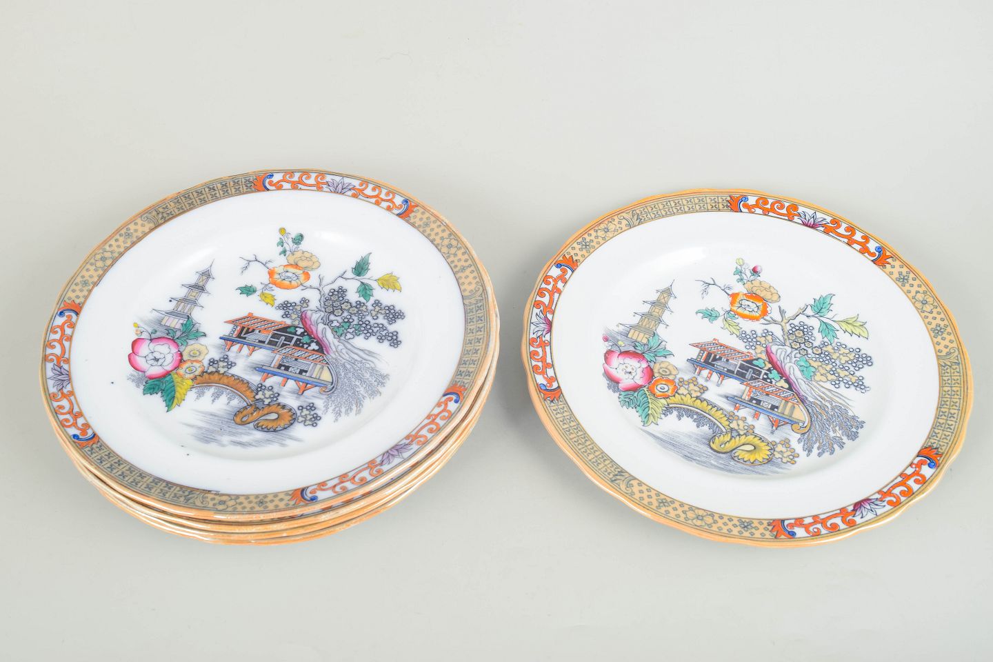 Rörstrand Japan series, set of five dinner plates.Dinner plates in faience with oriental-inspired decoration in polychrome colours and finely detailed painting in Japanese style, characteristic of Rörstrand’s japonisme production from the early 20th century.