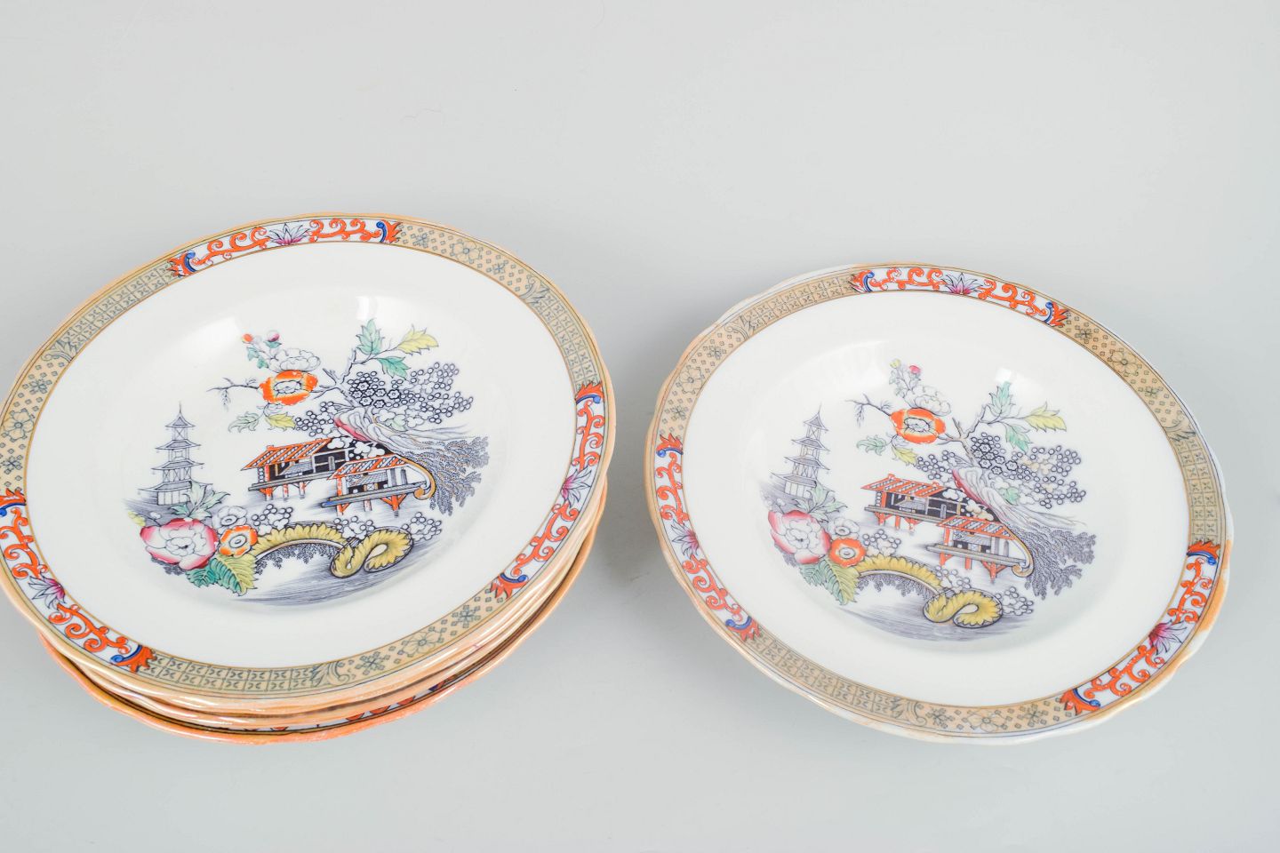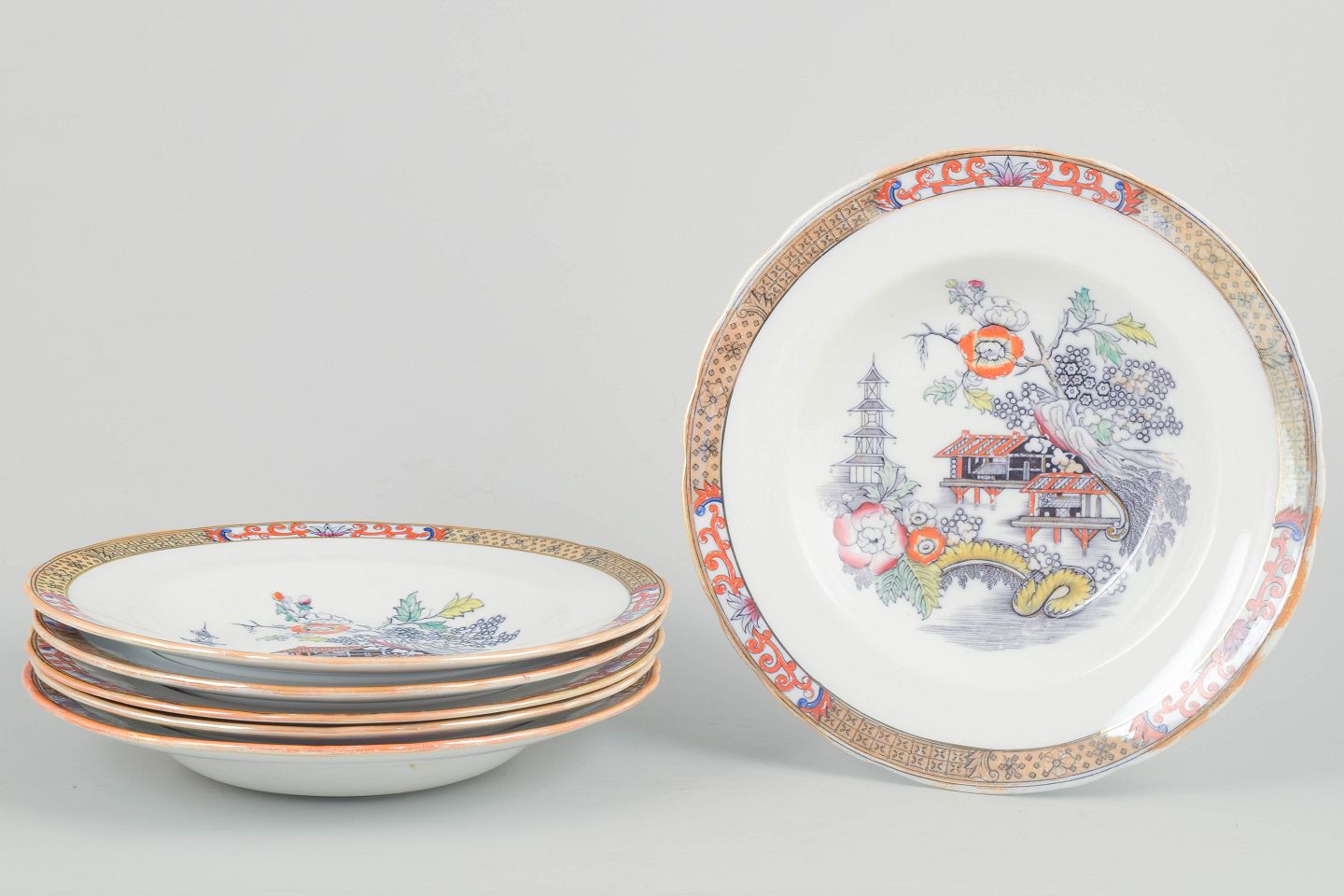 Rörstrand Japan series, set of six deep plates.Deep plates in faience with oriental-inspired decoration in polychrome colours and finely detailed painting in Japanese style, characteristic of Rörstrand’s japonisme production from the early 20th century.