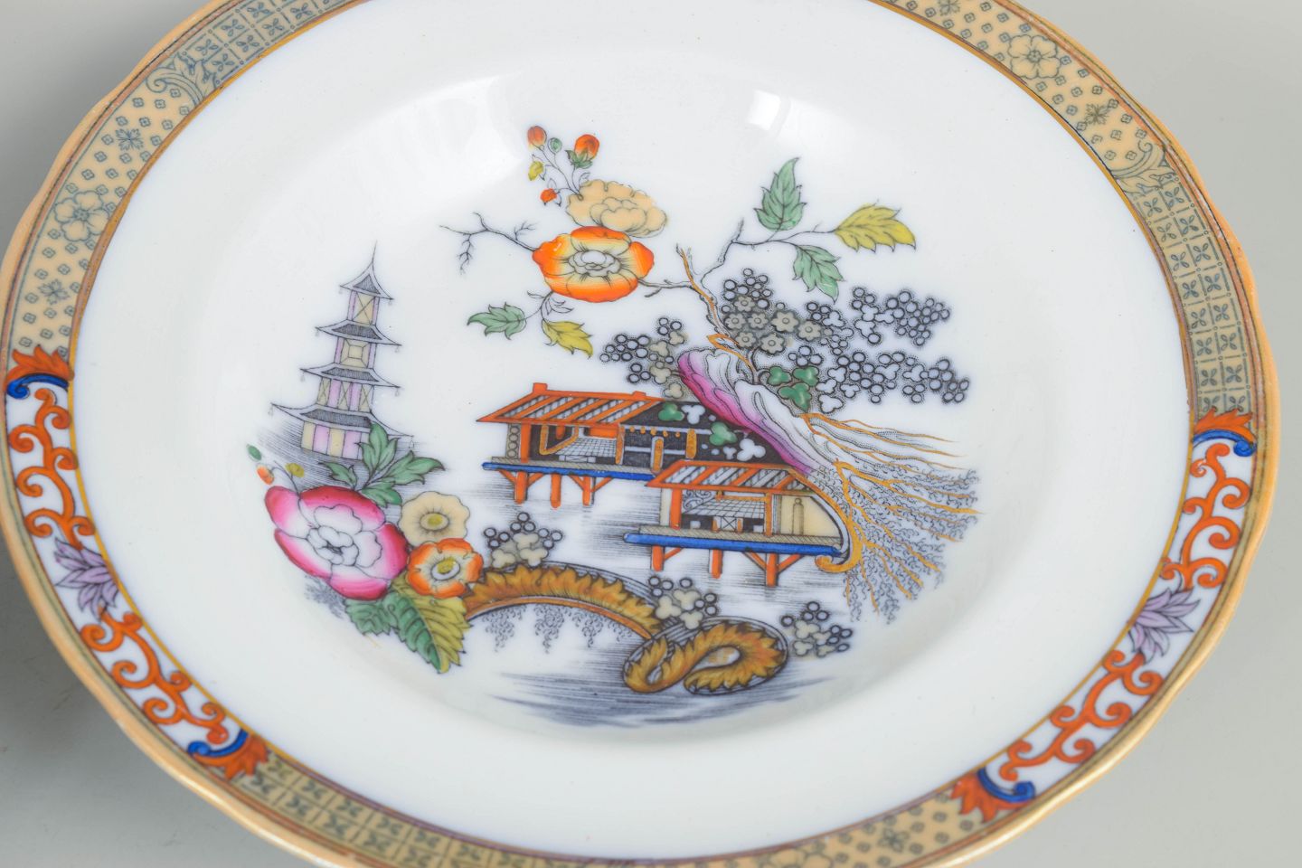 Rörstrand Japan series, set of six deep plates.Deep plates in faience with oriental-inspired decoration in polychrome colours and finely detailed painting in Japanese style, characteristic of Rörstrand’s japonisme production from the early 20th century.