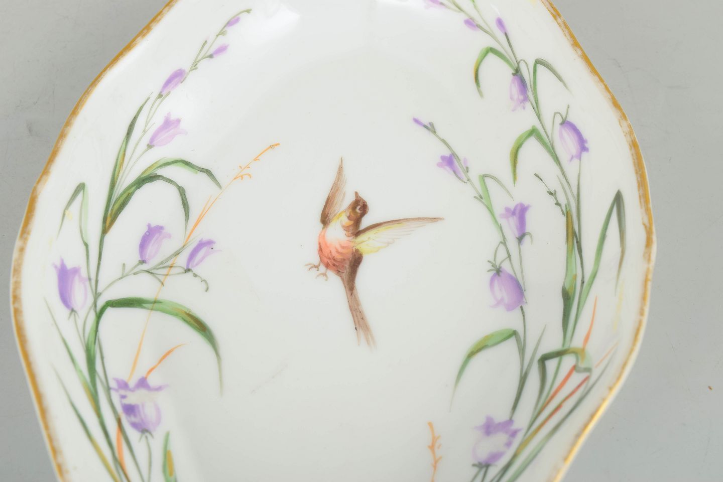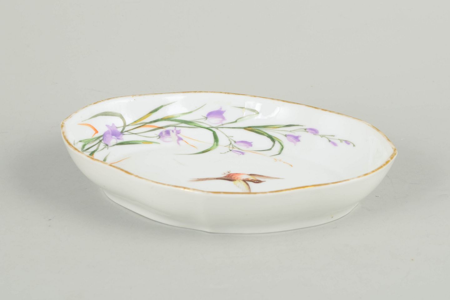 Royal Copenhagen, oval dish with bird motif.Antique oval dish in hand-painted porcelain featuring a central bird motif surrounded by floral decoration in purple and green tones, finished with a gilded rim.