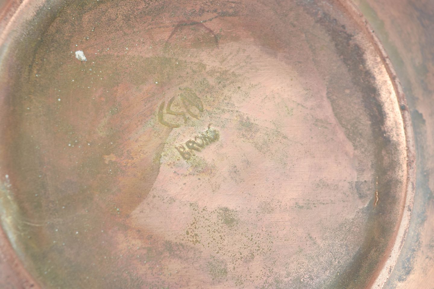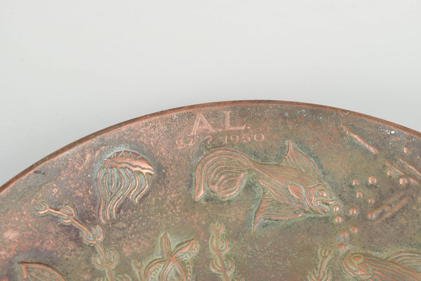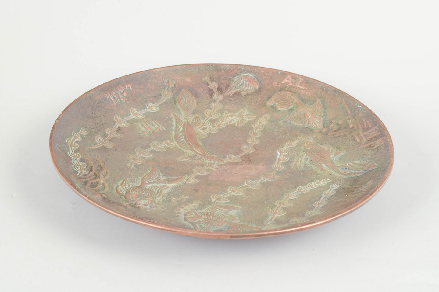 Gunnar Nylund, bronze dish.Rare circular bronze dish with relief decoration of stylised fish, aquatic plants and organic forms, executed with a characteristic patinated surface in warm copper and green tones. With engraved initials from a previous owner.