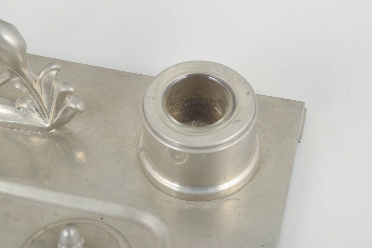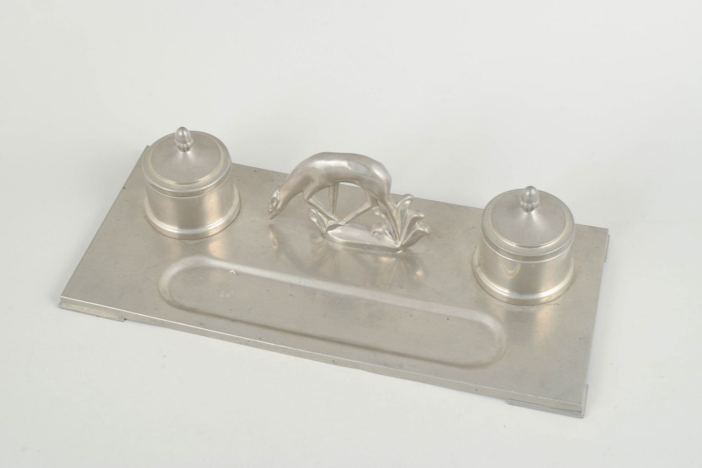 Carl Einar Borgström for Ystad Tenn, pewter ink well.Rectangular pewter ink well with two containers and a sculptural deer figure at the centre. One glass insert is missing. Marked on the base.