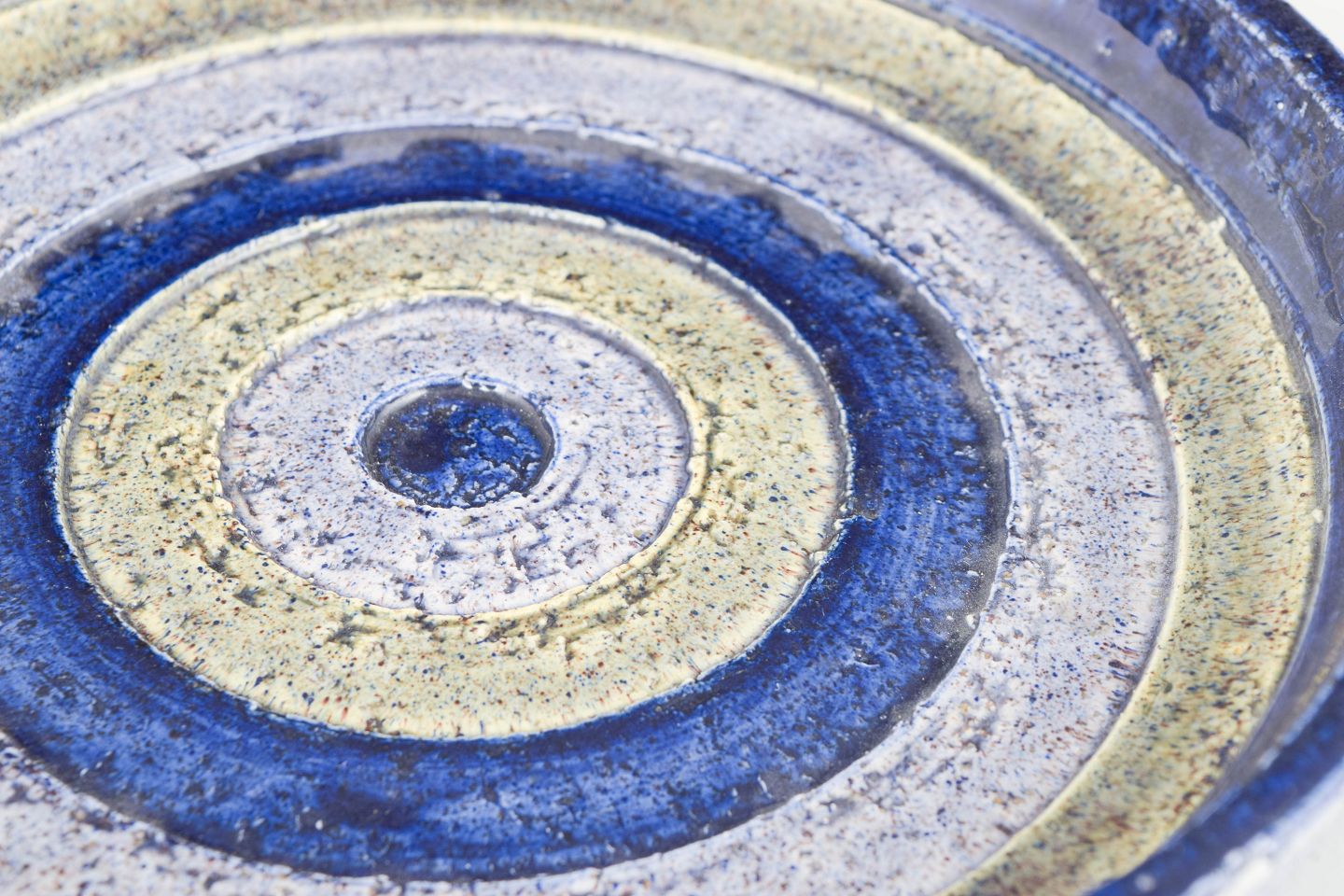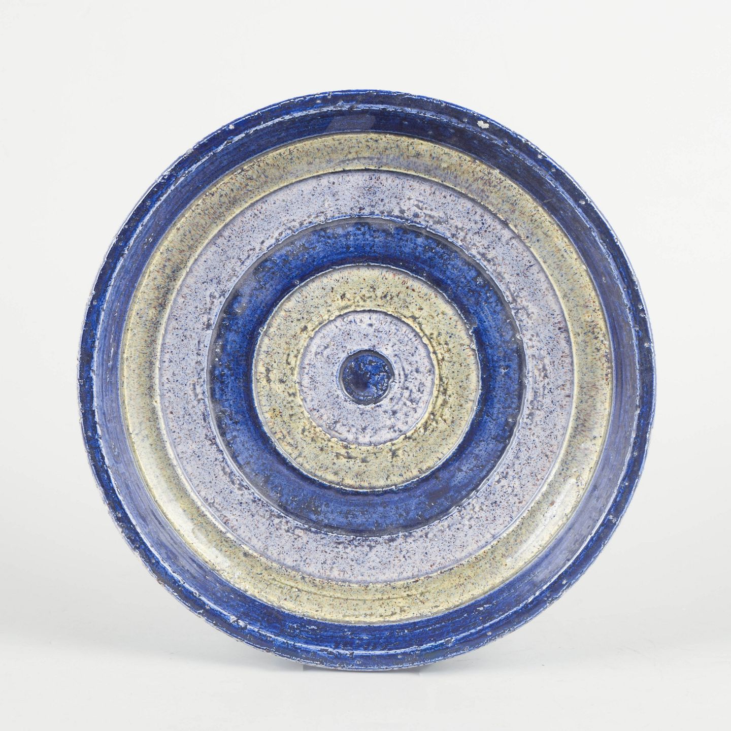 Aldo Londi for Bitossi, dish.Handmade circular ceramic dish with concentric rings and characteristic glaze in blue, cream and sandy tones. Produced in the 1970s in Bitossi’s distinctive artistic style.