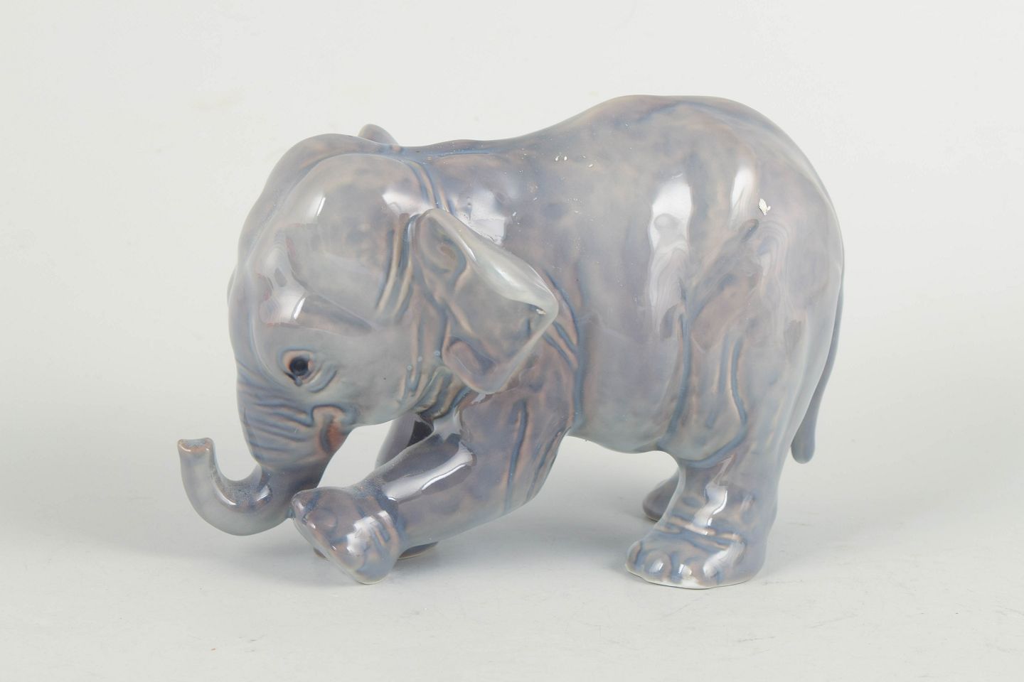 Bing & Grondahl, baby elephant figurine.Naturalistically modelled elephant in porcelain model 2575 with a soft, iridescent glaze in grey and bluish tones. Finely detailed surface and marked as first factory quality on the base.