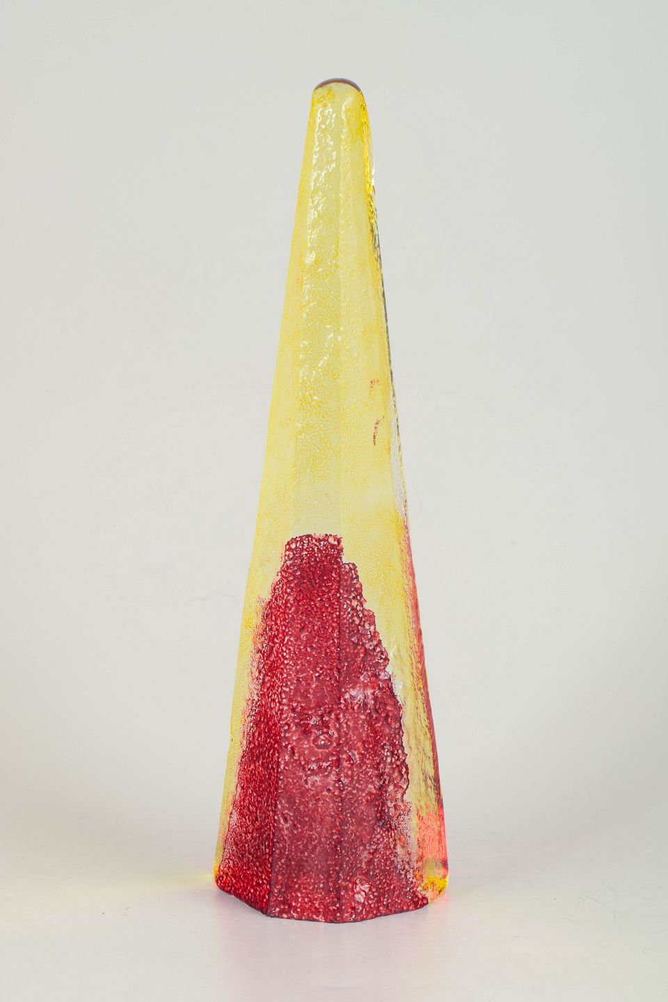 Björn Hultqvist for Bergdala, unique art glass object.Tall conical sculptural form in mouth-blown glass with encased colours in yellow, red and clear tones. Signed Bergdala B. Hultqvist.