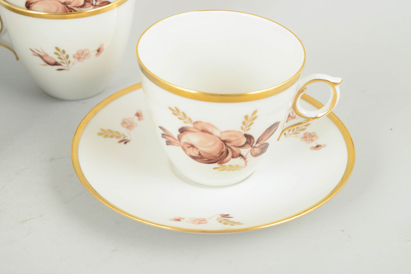 Coffee cups with matching saucers in white porcelain with brown floral decoration and gilded rim, model 688/9069, from the 1970s, first factory quality.