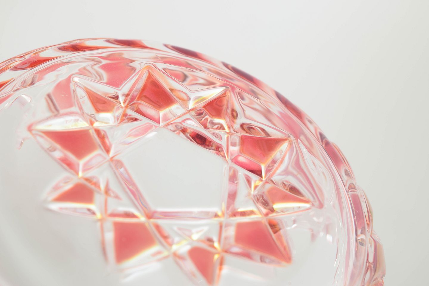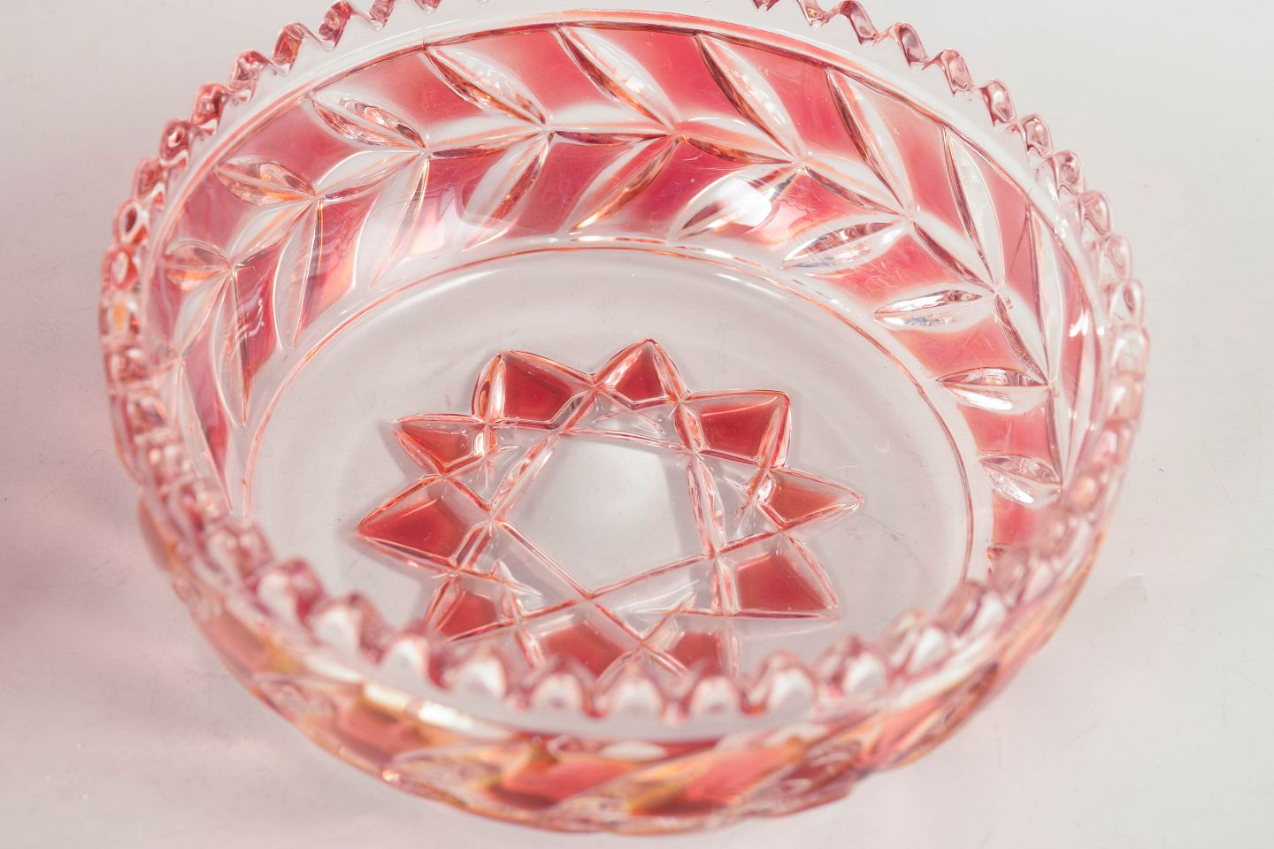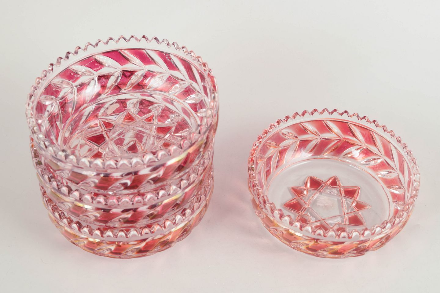 Bohemian crystal glass, set of four dessert bowls.Pressed and cut crystal bowls in clear and pink tinted glass with geometric star pattern and faceted edges.