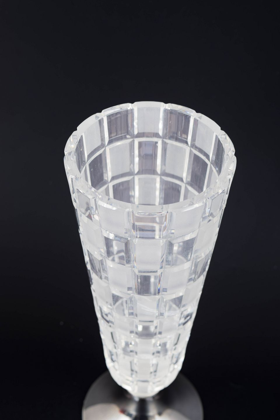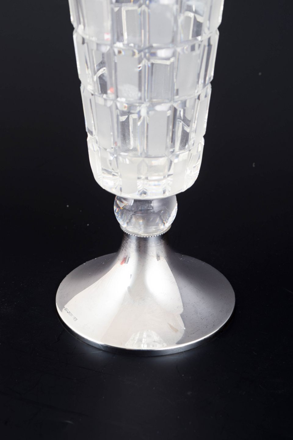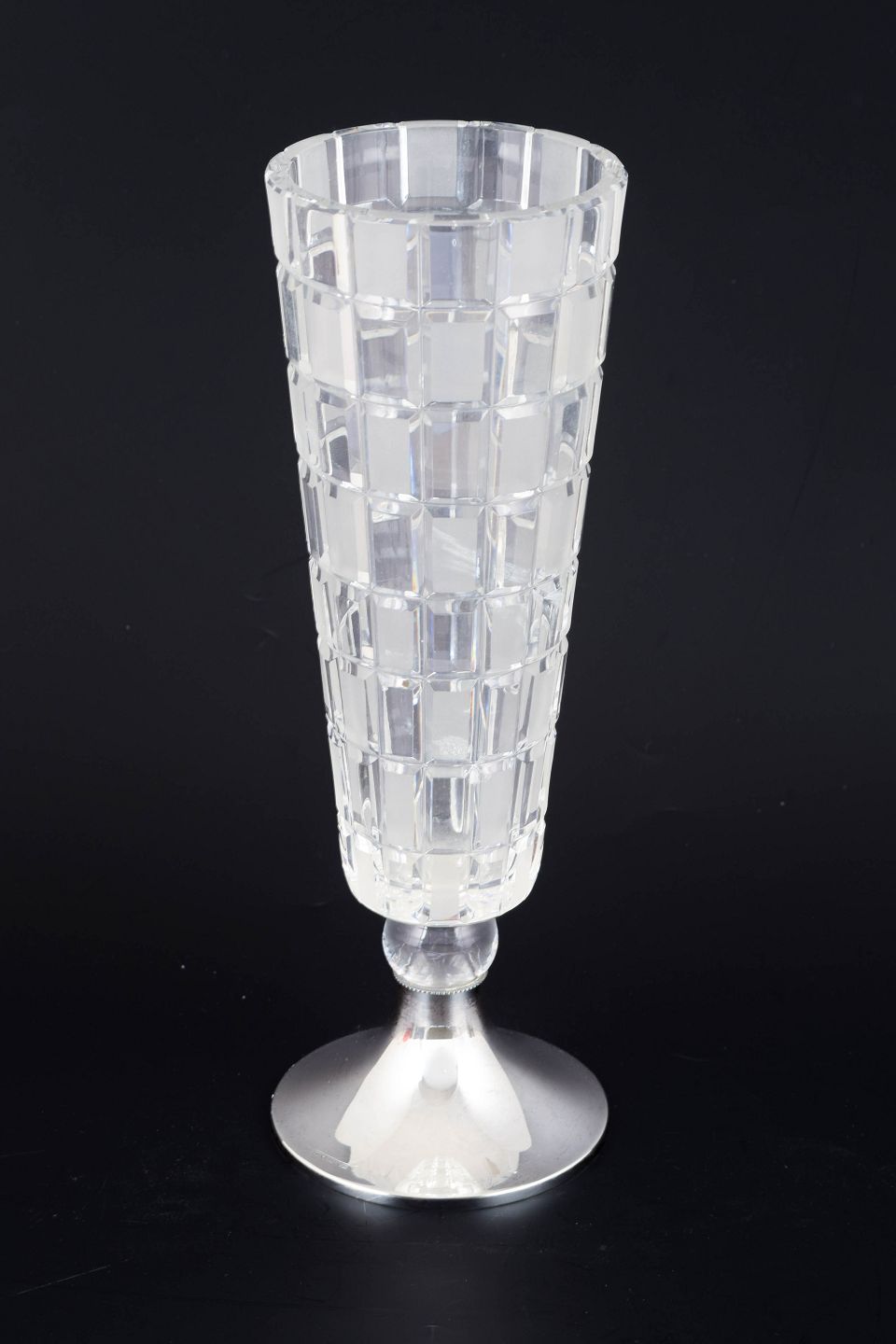 Aimo Okkolin for Riihimäki Glass, “Ruuta” vase.Modernist vase in cut crystal with a geometric pattern and base in 813 silver. The design features a clear, architectural structure characteristic of Finnish glass design of the period.