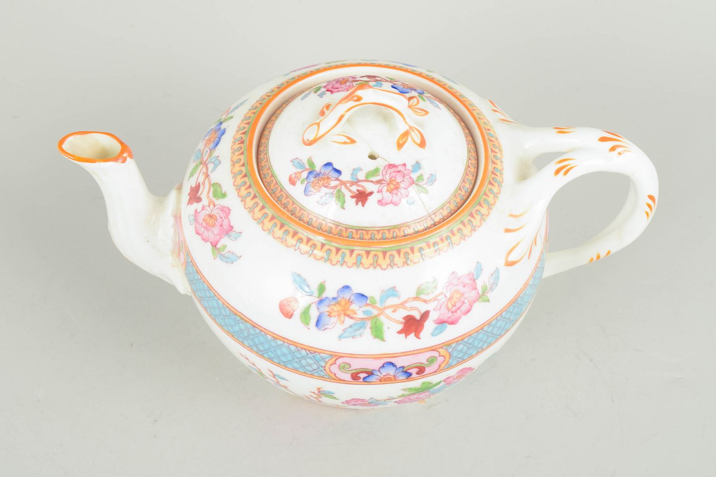 Cauldon China England, porcelain teapot.Decorated with polychrome floral motifs in an oriental-inspired style with turquoise and gilt borders. Lid with finial and curved handle, marked on the base.