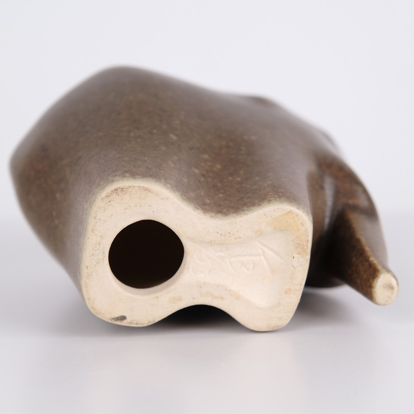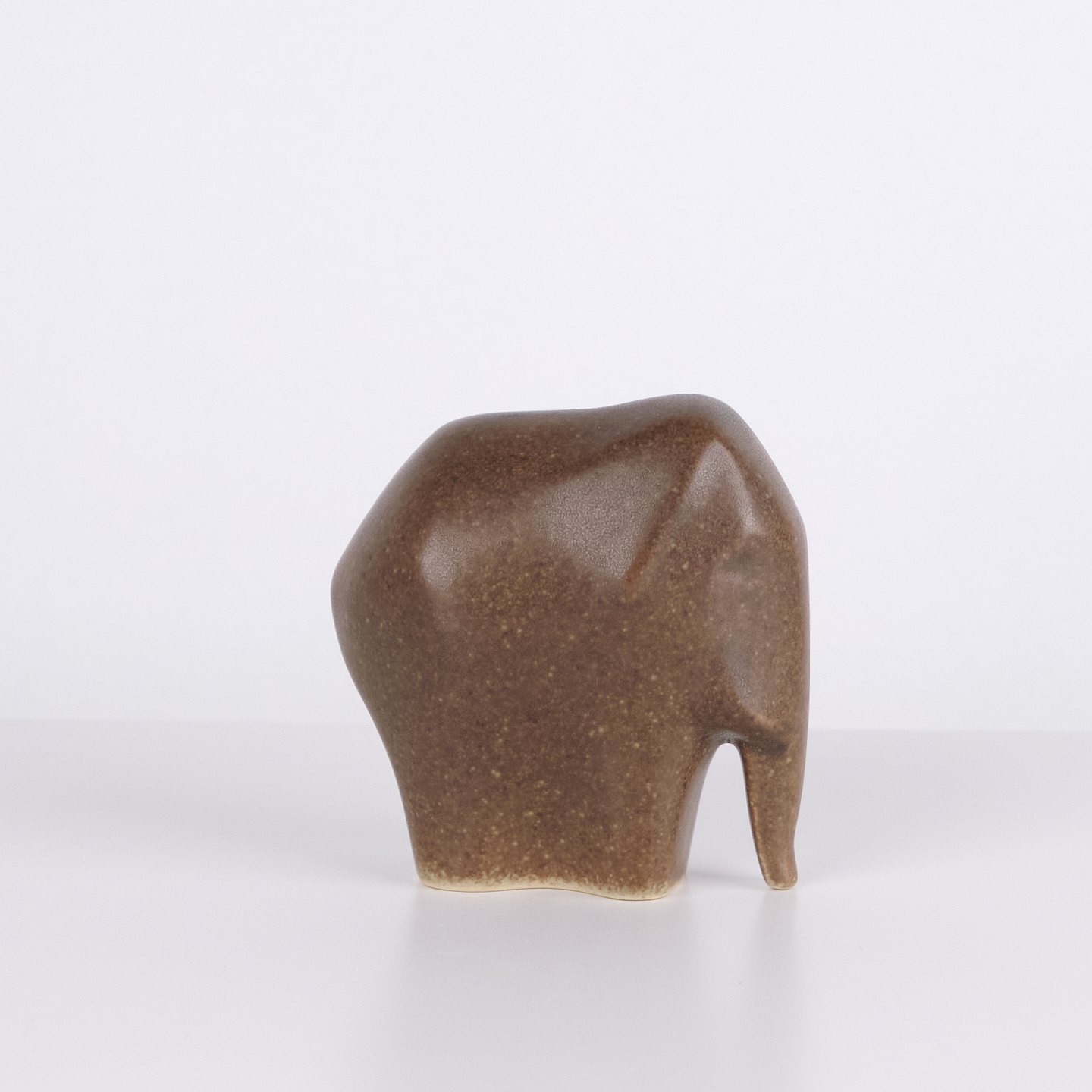 Elephant figure by Knud Basse made in brown glazed ceramic. The figure is modeled in a simple compact form with downward curved trunk and rounded sides. Minimalist model from Knud Basse’s series of animal figures, produced in Denmark in the 1960s.— Origin: Denmark