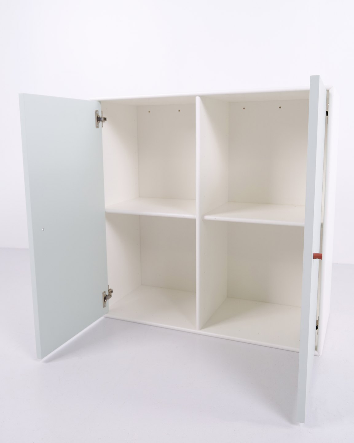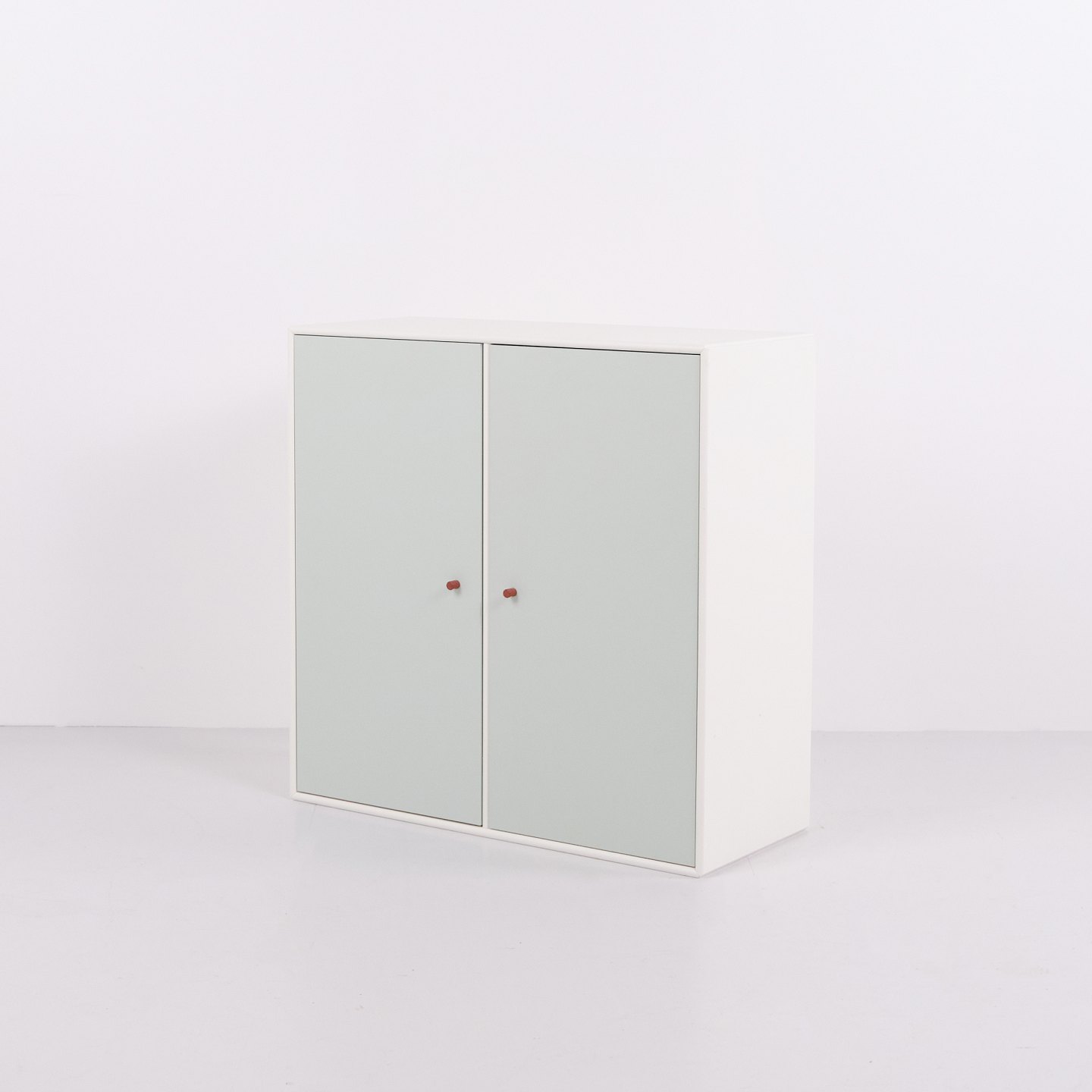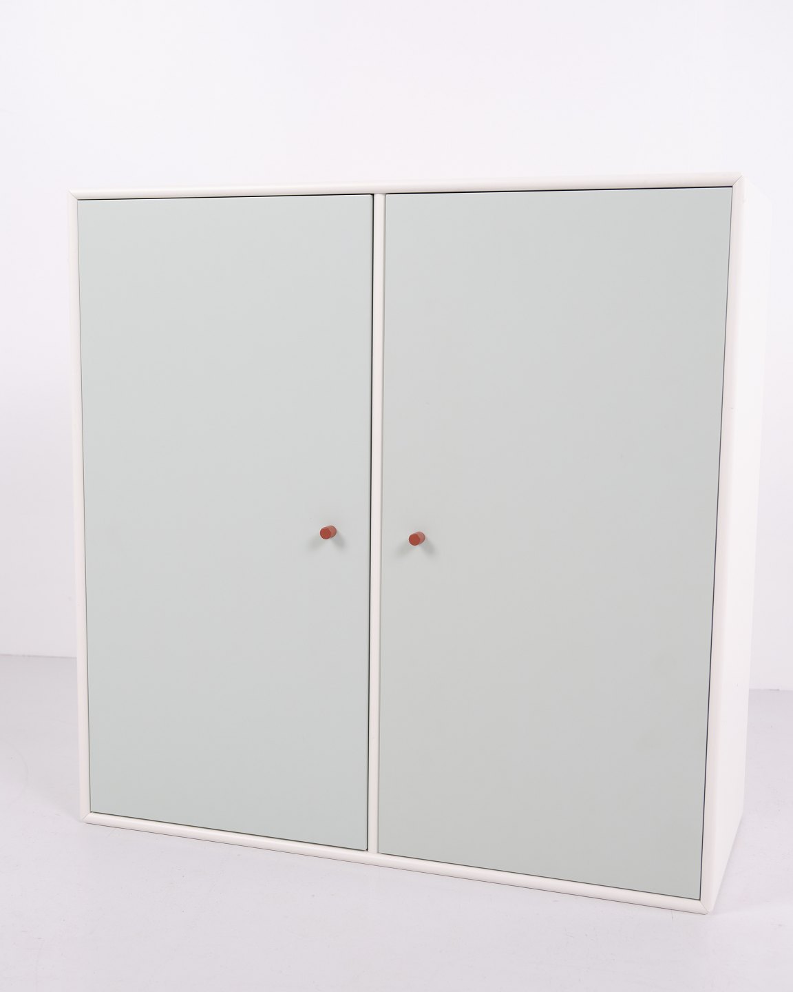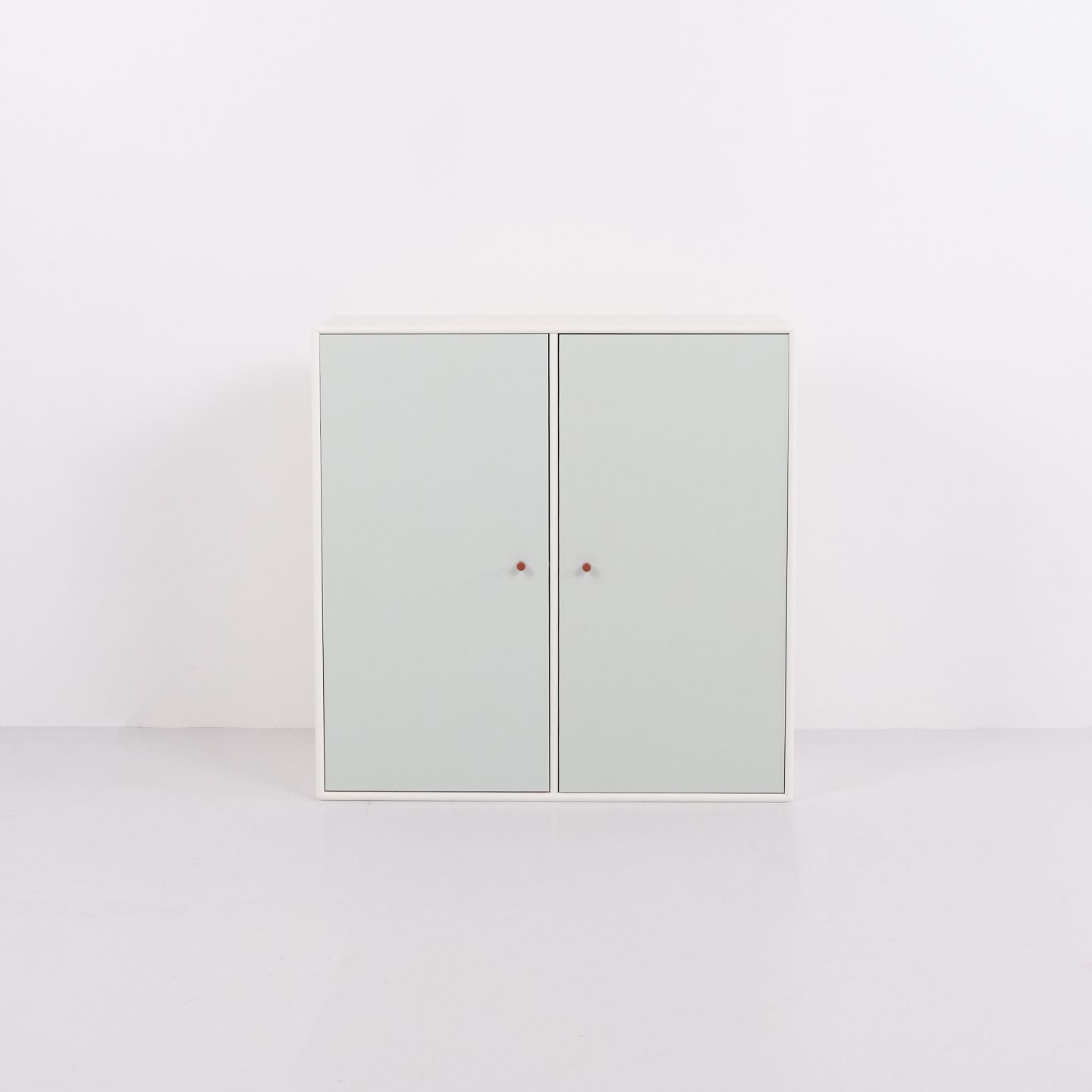 Montana cabinet module from the Montana System designed by Peter J. Lassen for Montana. Made of lacquered MDF with white корпус, two mint green doors and brown handles. Suitable as a wall cabinet, hallway unit or storage module. 2 pieces in stock.— Origin: Denmark