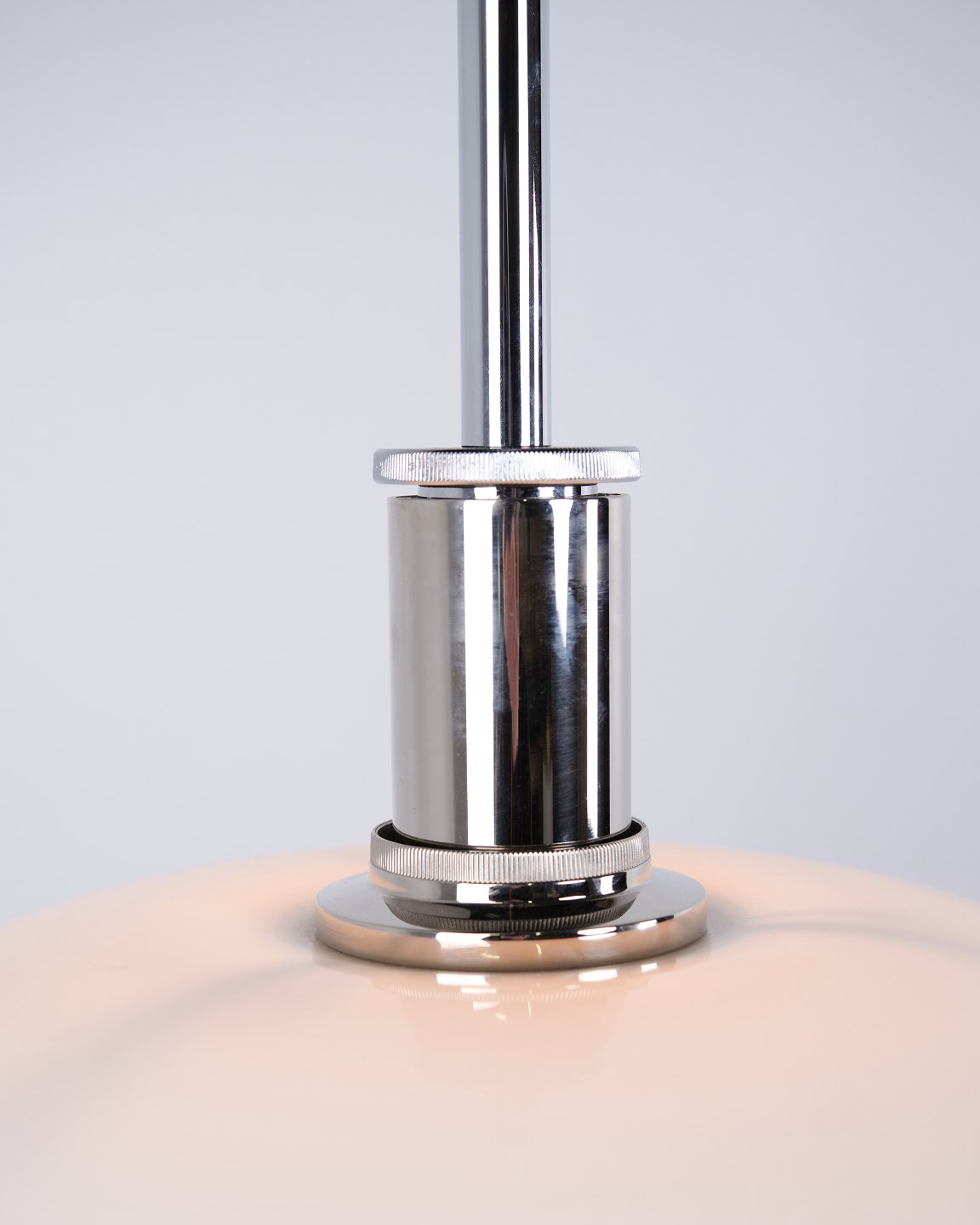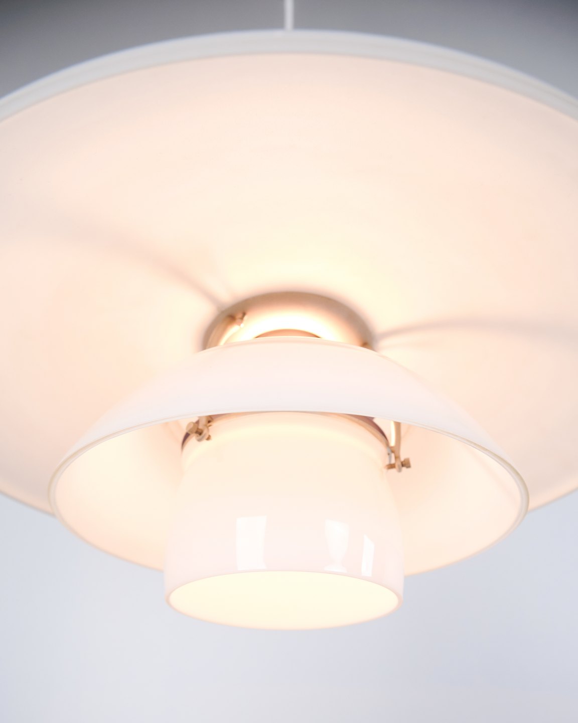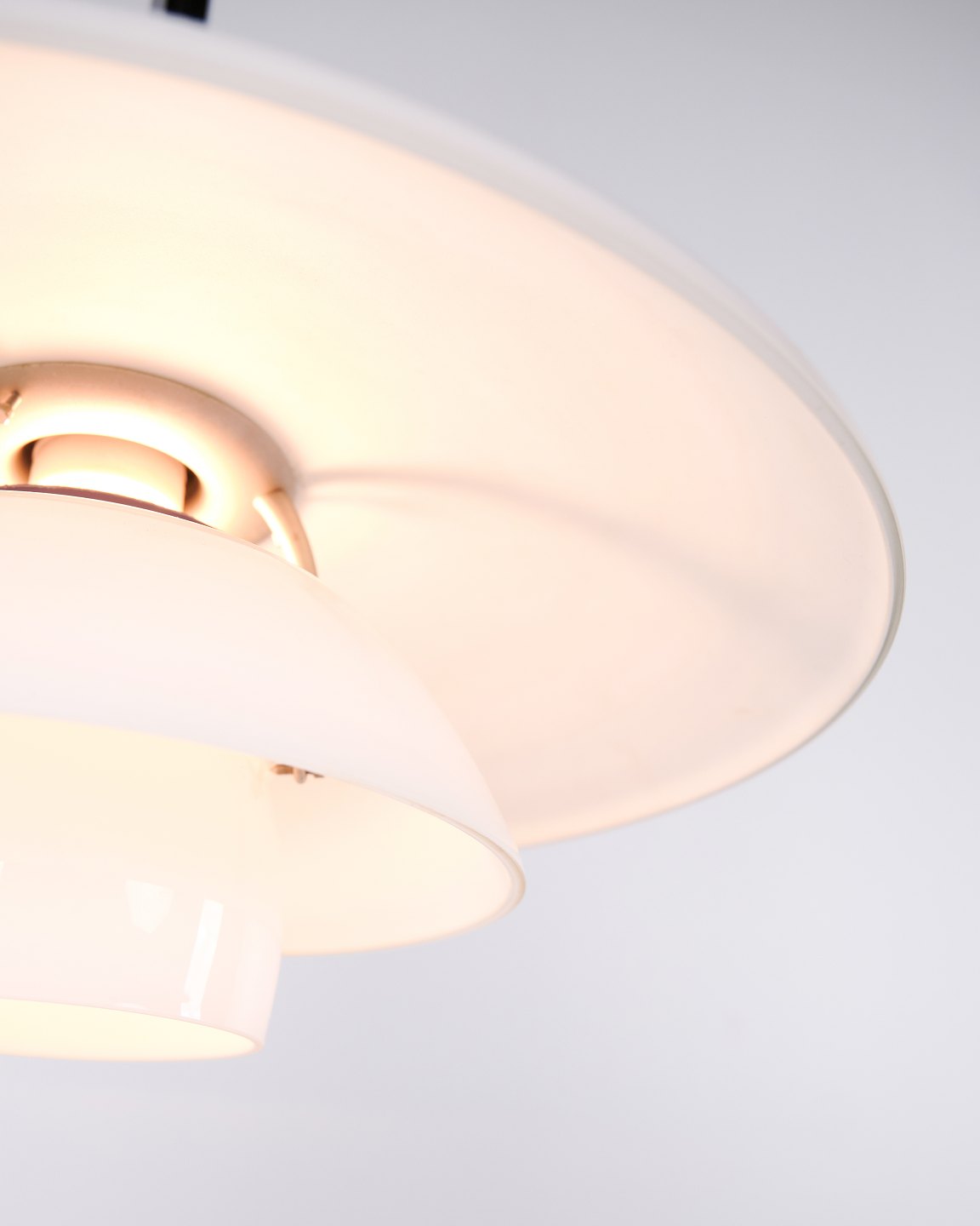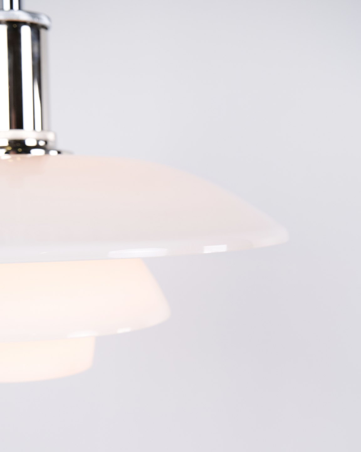 PH 4½-4 pendant designed by Poul Henningsen for Louis Poulsen. The lamp is made with hand-blown three-shade screens in white opal glass and chrome suspension. The model has a top shade of approximately 45 cm and uses the lower shades from the PH 4/4 series, developed to provide wider light distribution when hung low above a dining table or tabletop. The current version was introduced in 1980 and is part of the iconic PH glare-free lighting system.— Origin: Denmark