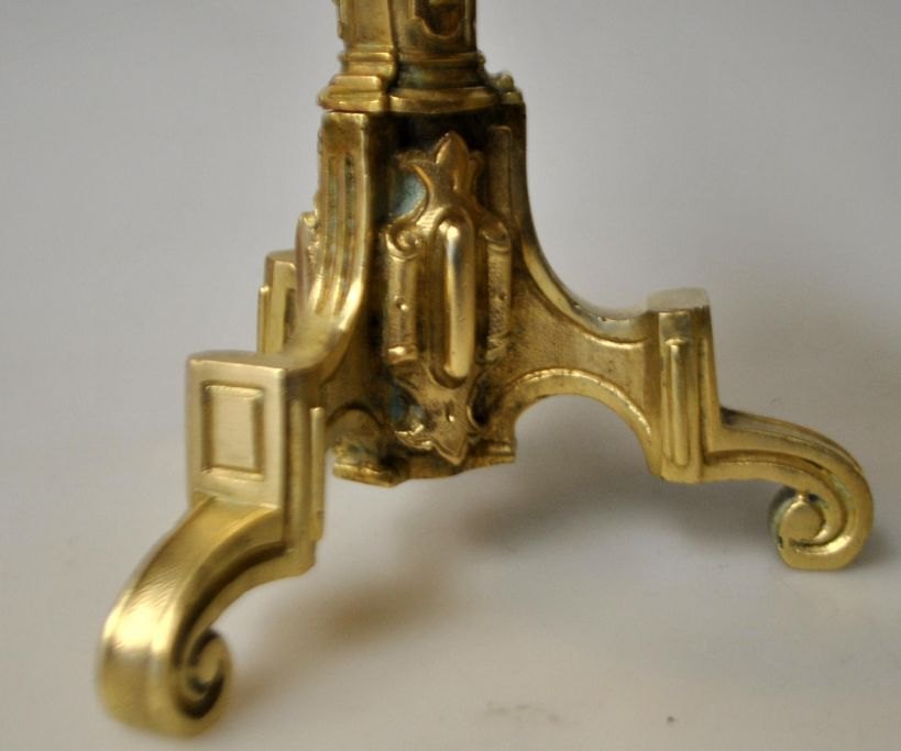 Pair of French bronze candlesticks, 19th century. With decorations in the form of faces. On three legs. H.: 17 cm.Item number: 29164