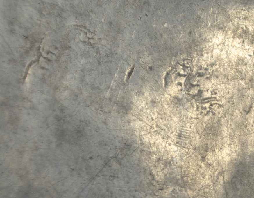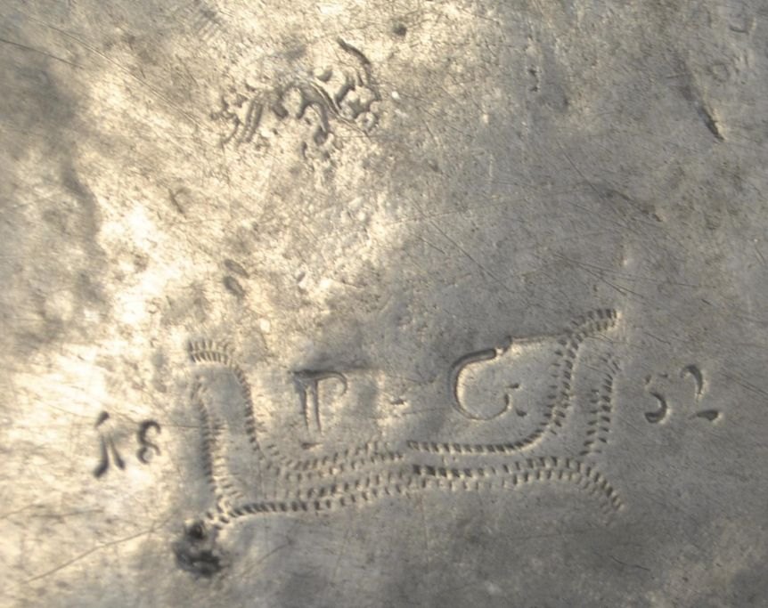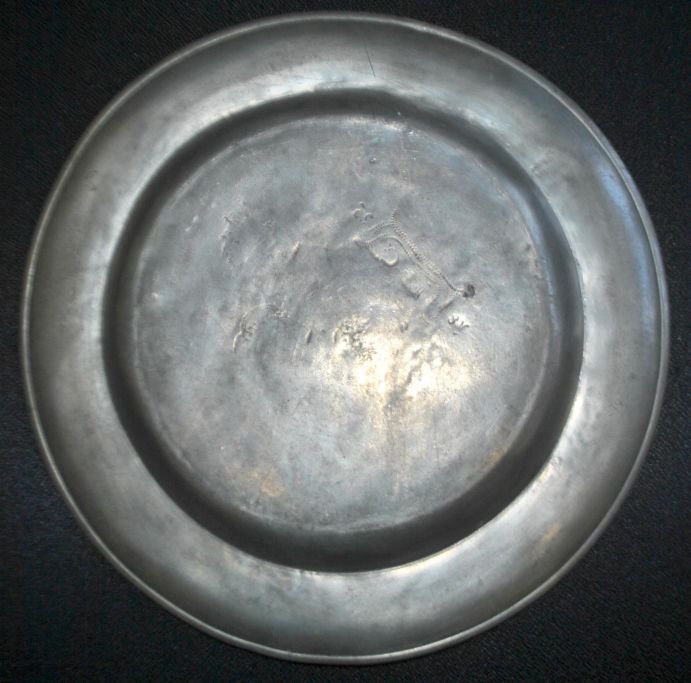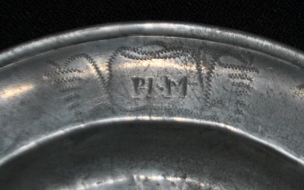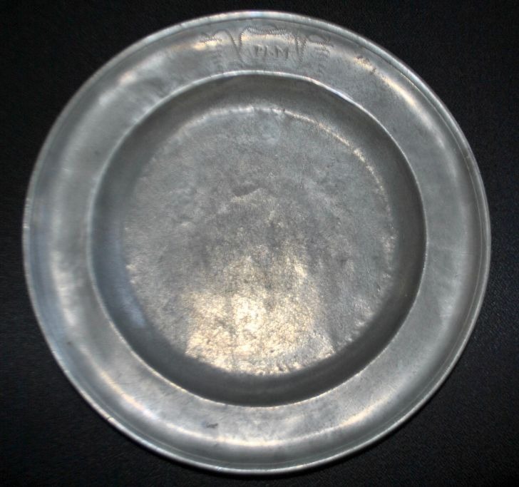 Pewter dish, 18th century. With stamps and engravings. Engraving on the front: PH.M and floral decoration. On the underside: P. G 1832. Unclear master stamps. Diameter: 29 cm.Very beautiful specimen!