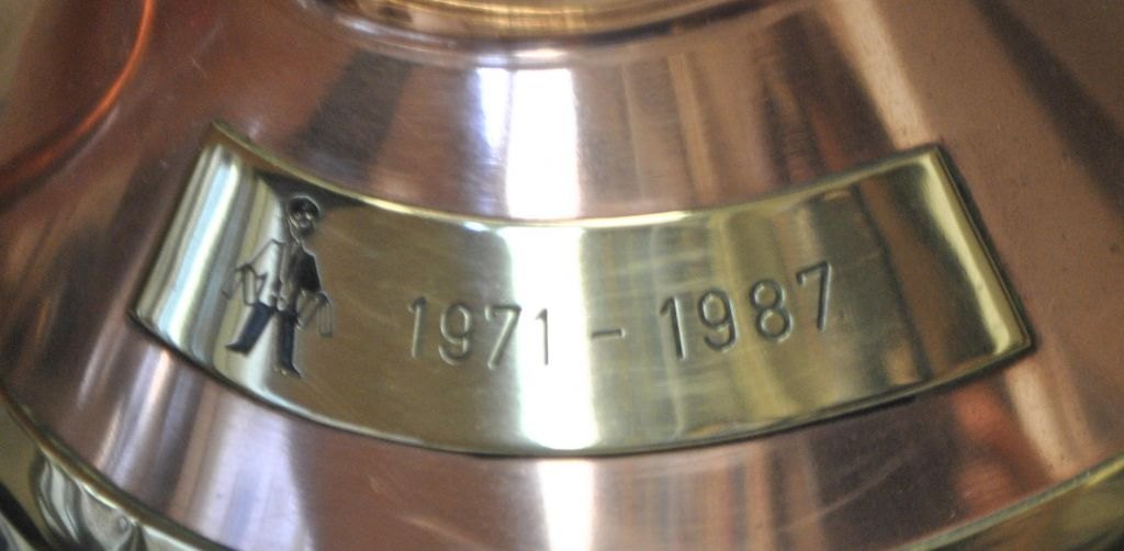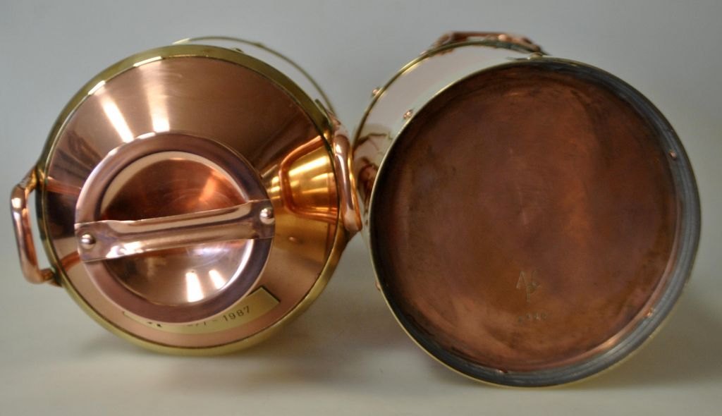 Pair of copper cans with brass fittings, 1986-88, Denmark. With two handles and lid. Stamped: ACP 1986 and ACP 1988. One with logo from Mejeriet Enigheden. H: 20.5 cm.Item number: 29044