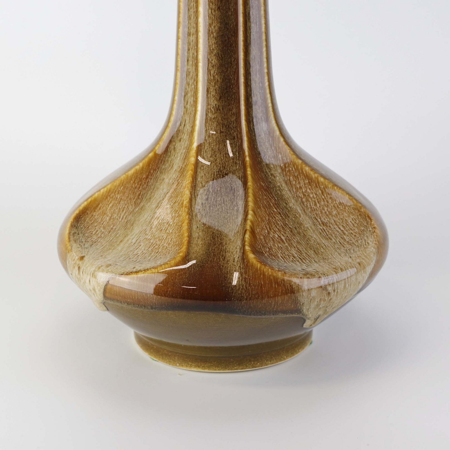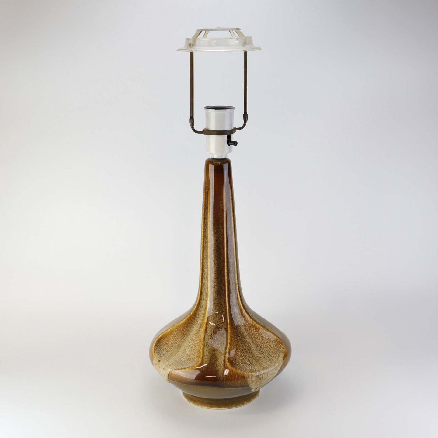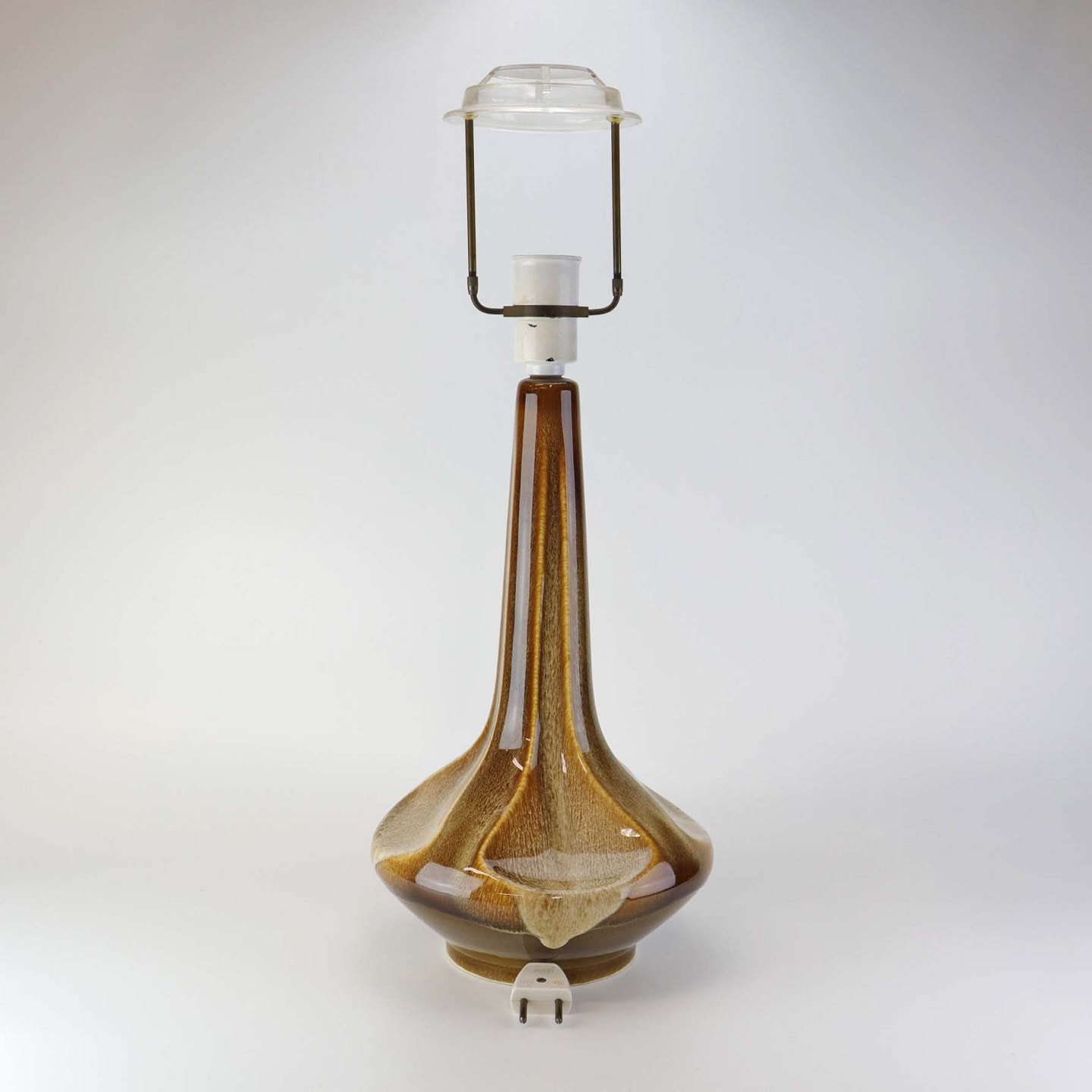 Lampefod i stentøj med harepelslignende glasur i brunlige nuancer. Ledningen ligger indeni foden. Nr. 1207Producent Søholm, Denmark