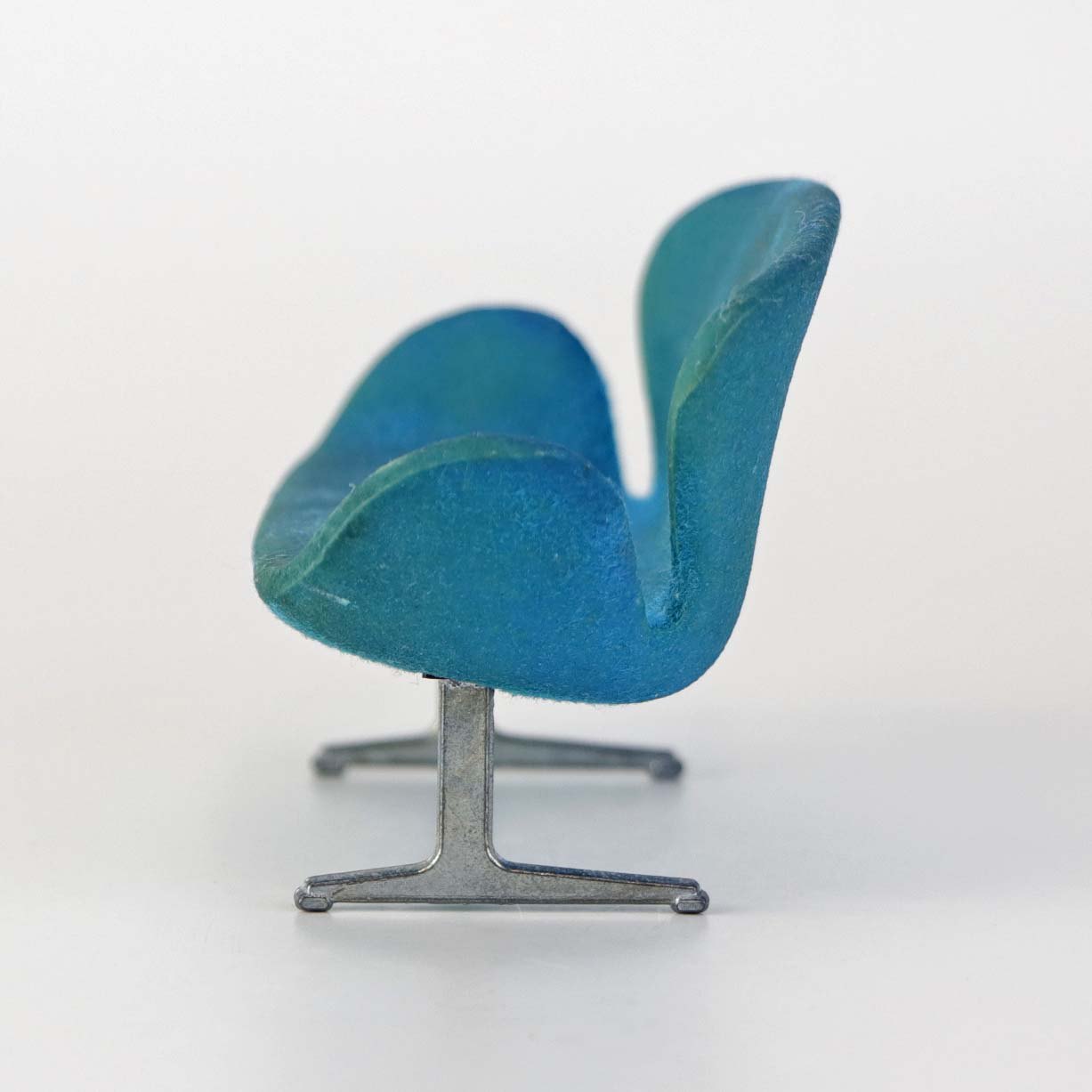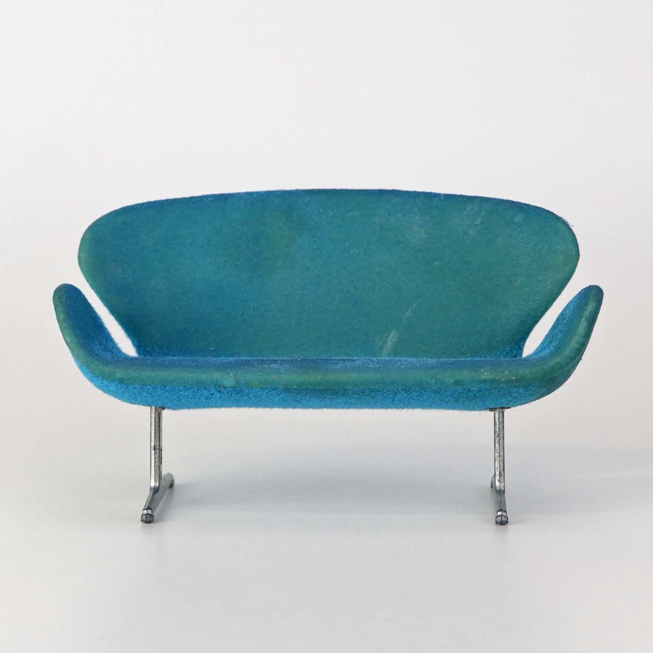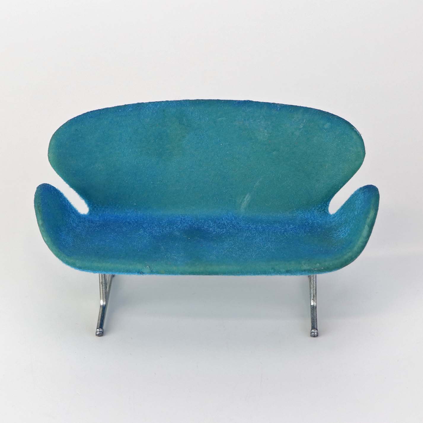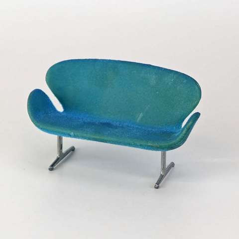 Miniature designermøbel til dukkehus med model af Arne Jacobsen's Svanesofa i blå farve med stel i metal.