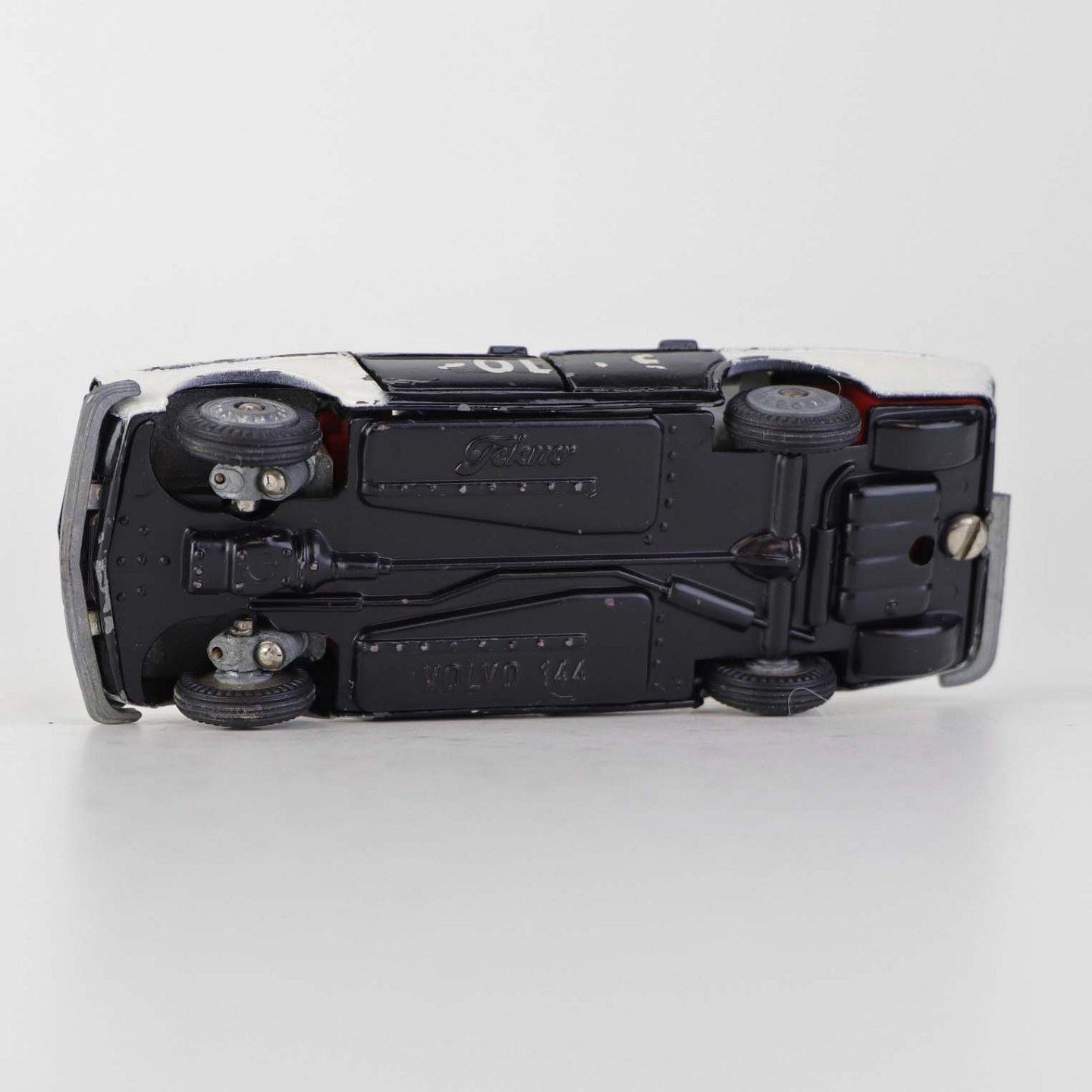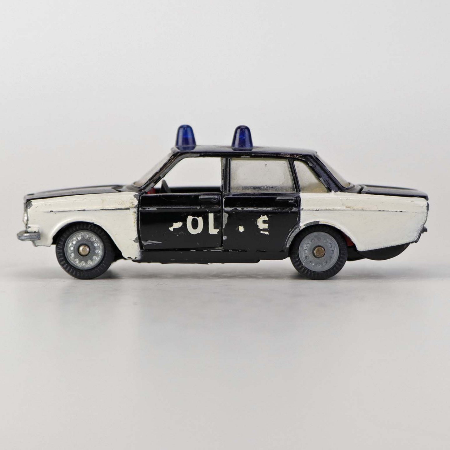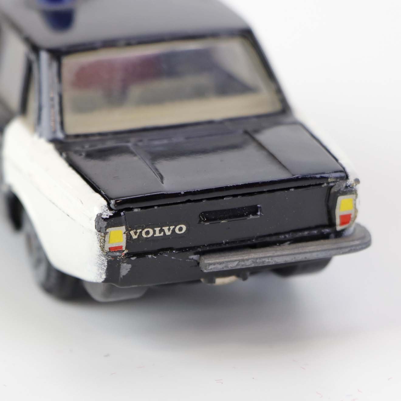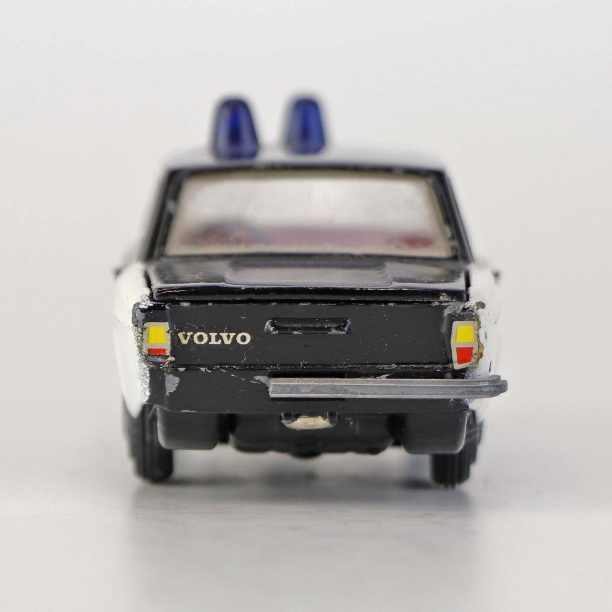 Politibil med to blinklys. Legetøjsbil i sortlakeret metal med gummi hjul og blå blinklys. Model Volvo 144 Producent Tekno, Denmark