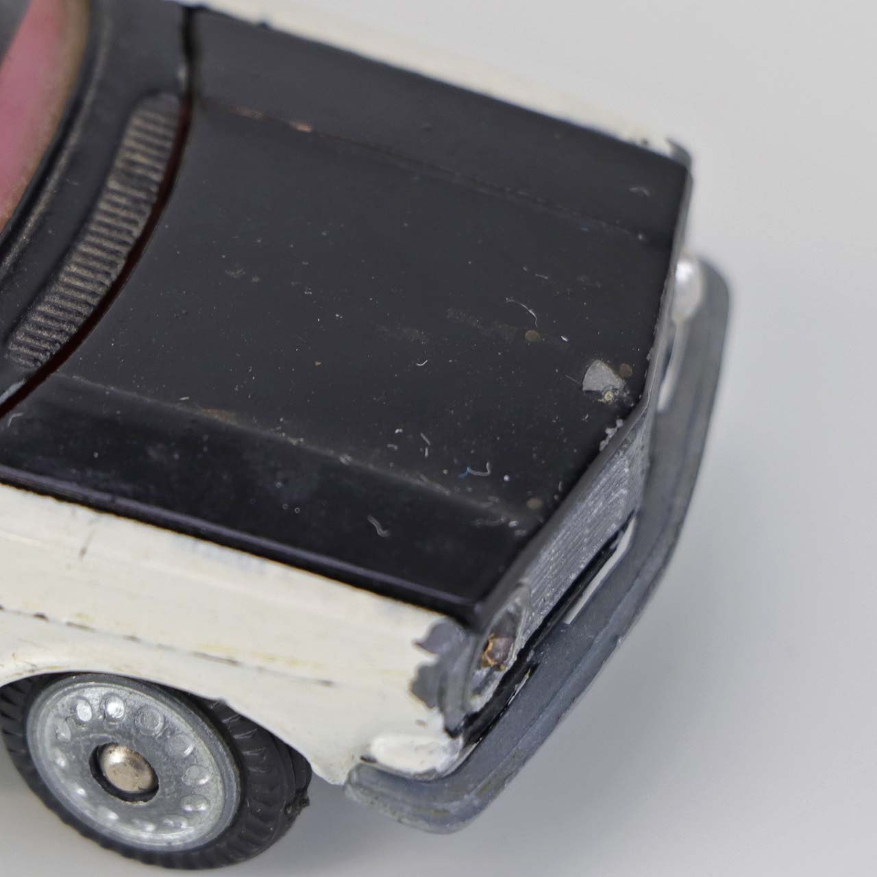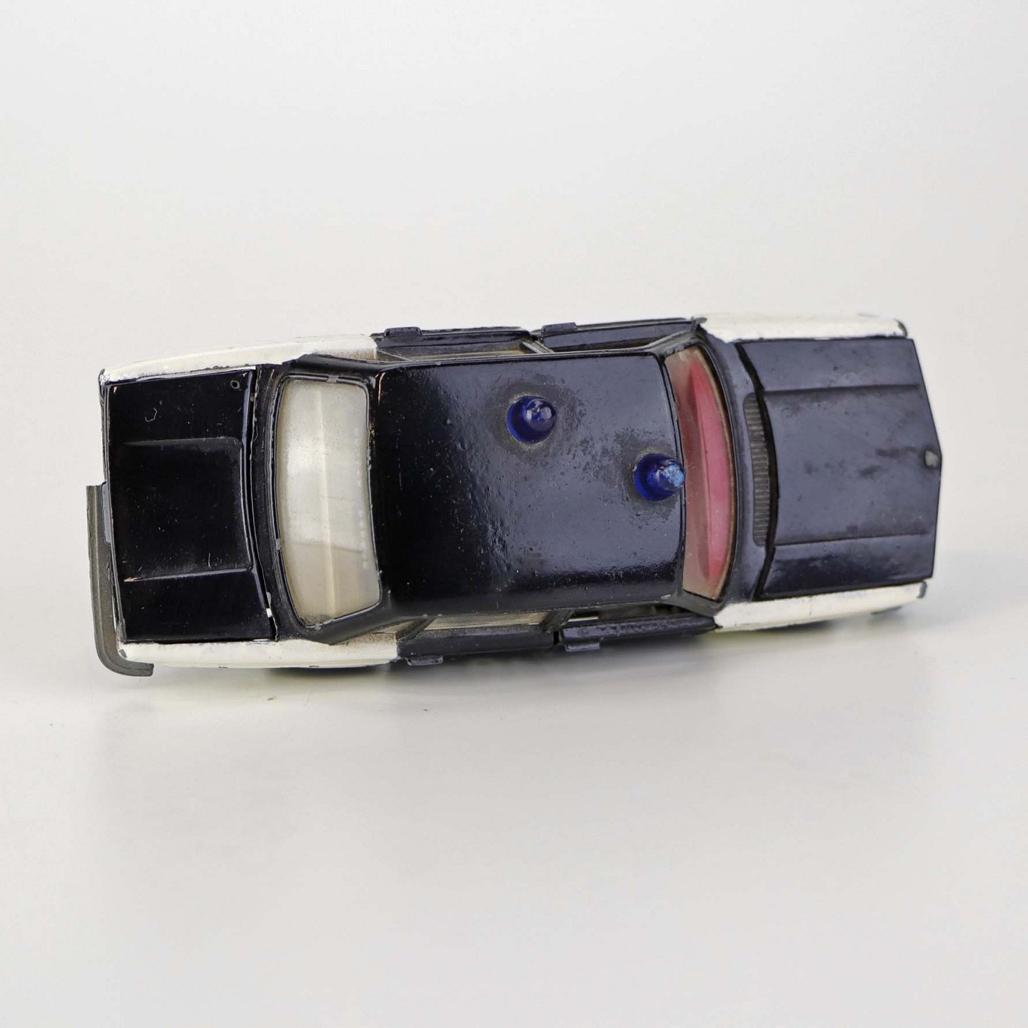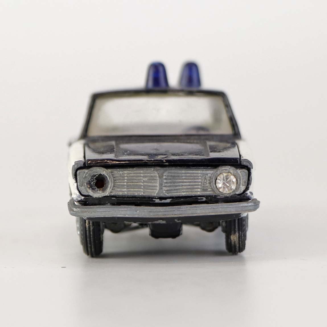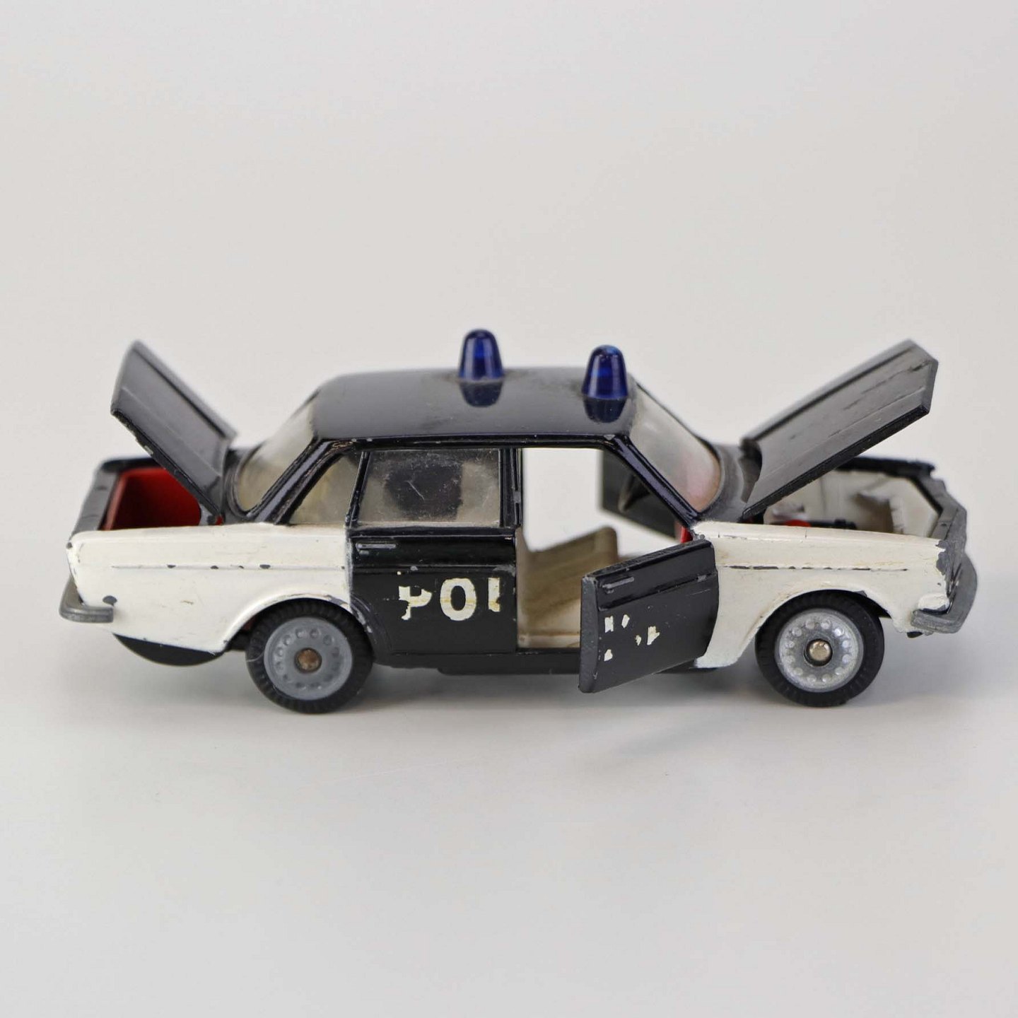 Politibil med to blinklys. Legetøjsbil i sortlakeret metal med gummi hjul og blå blinklys. Model Volvo 144 Producent Tekno, Denmark