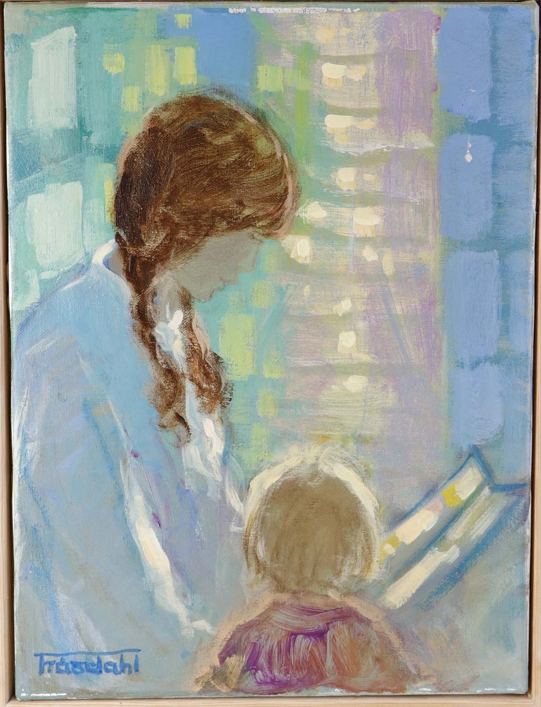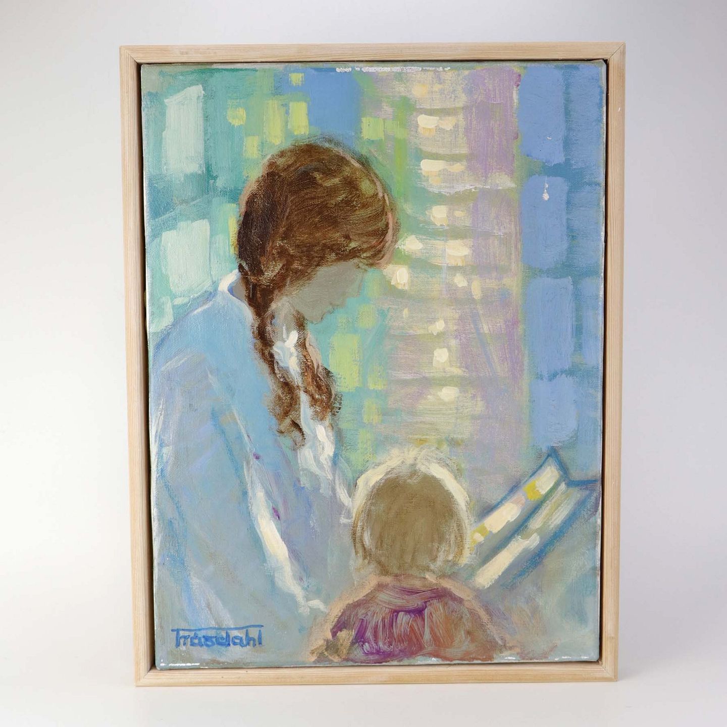 Maleri med olie på lærred i træramme. Et portrætmotiv i lyse pastelfarver af mor med barn.Kunstner Thomas Traasdahl Møller (1925-2002)