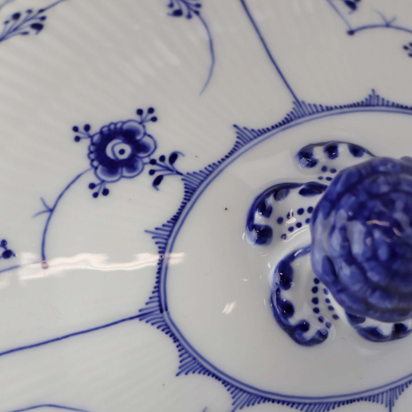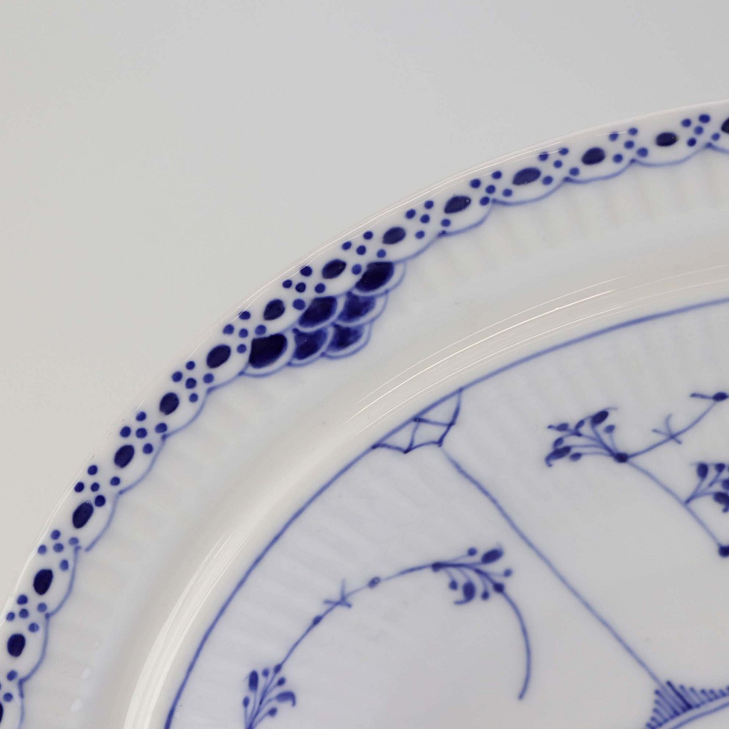 Musselmalet halvblonde er riflet hvidt porcelæn med dekoration af blå ranker og en kant med blonder.