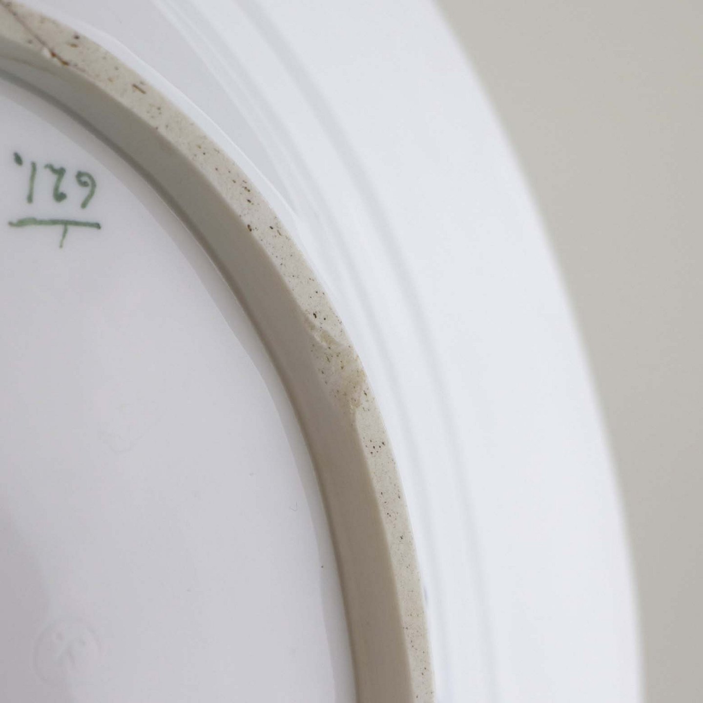 Fremstår med enkelte sorte nister i glasuren samt en mindre fejl ved kanten under bunden.