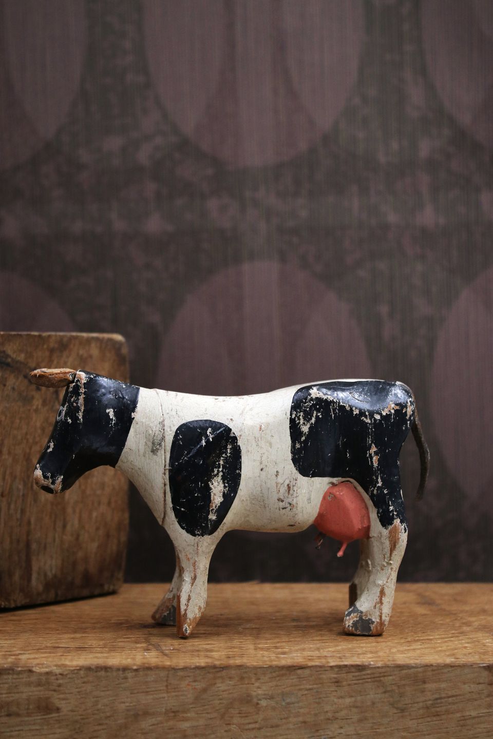 Decorative, old dairy cow in carved wood with fine original painting, horns and tail in leather. H: 9cm. L: 13.5cm. Dealer