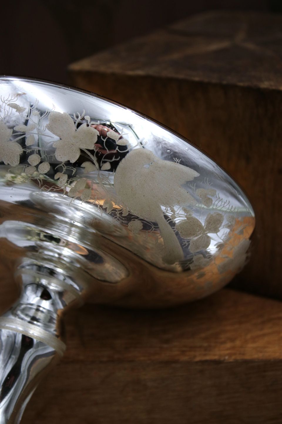 French 19th century bowl on foot in poor man's silver (Mercury glass) with fine etched decoration with birds and leafy tendrils.