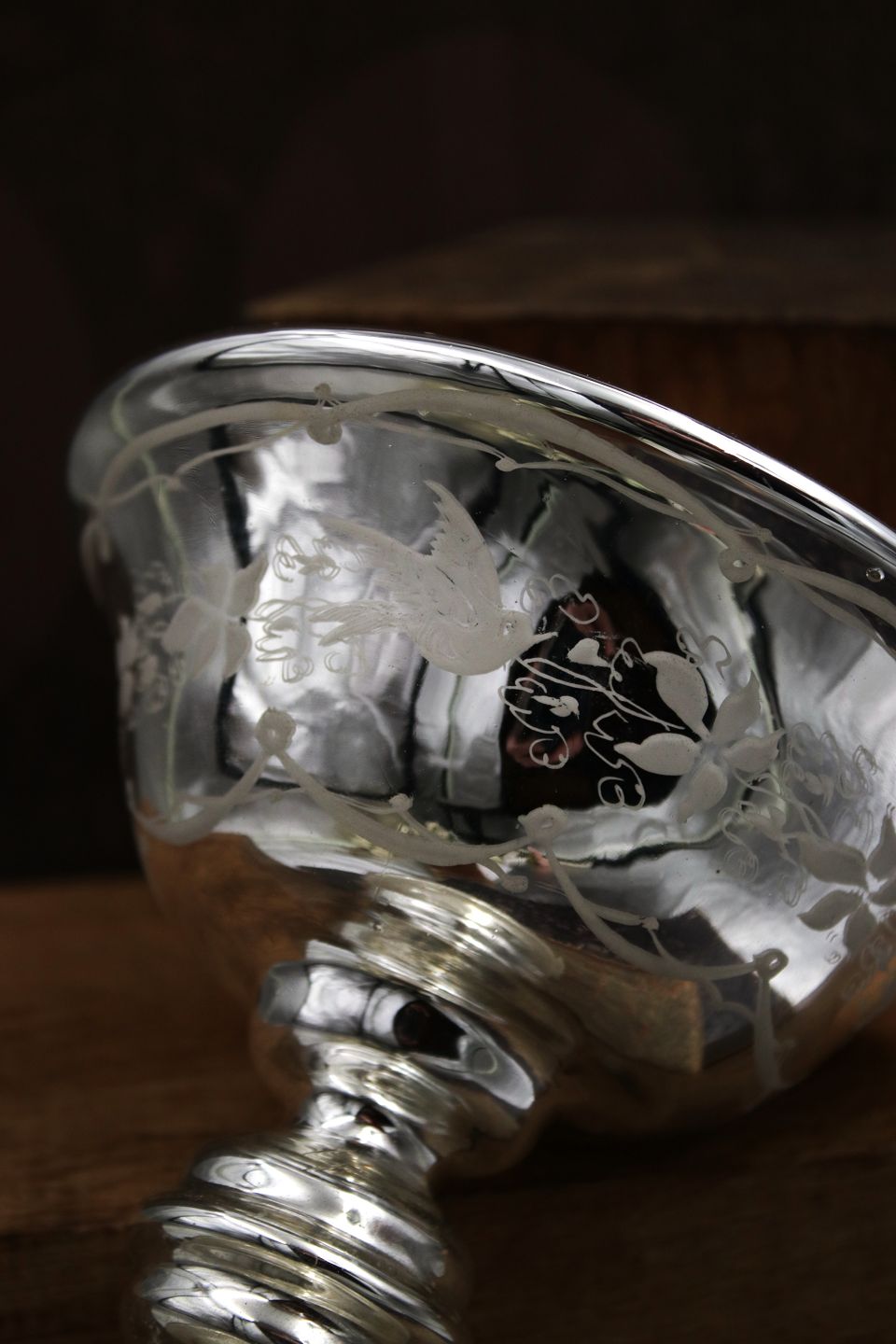 French 19th century bowl on foot in poor man's silver (Mercury glass) with fine etched decoration with birds and leafy tendrils. Height: 15cm. Dia.: 14.5cm.Item number: Fattigmandssølv skål nr.5