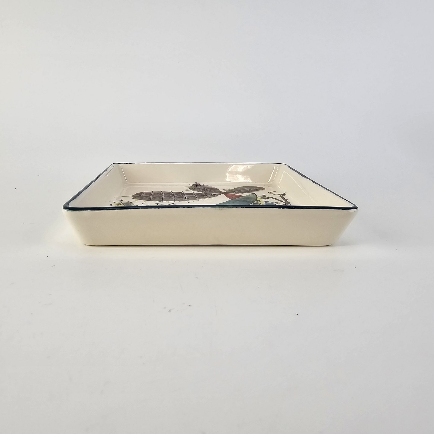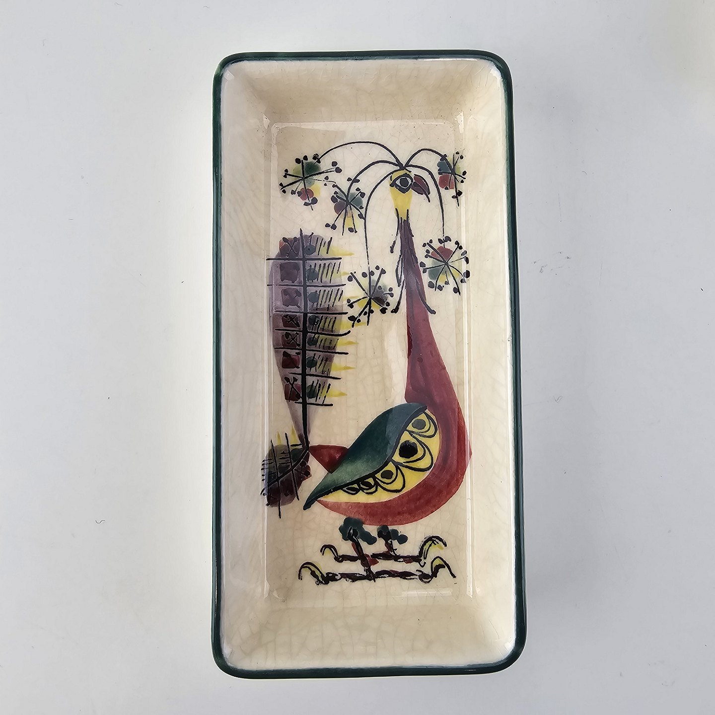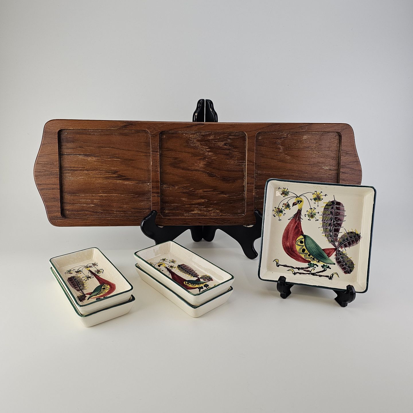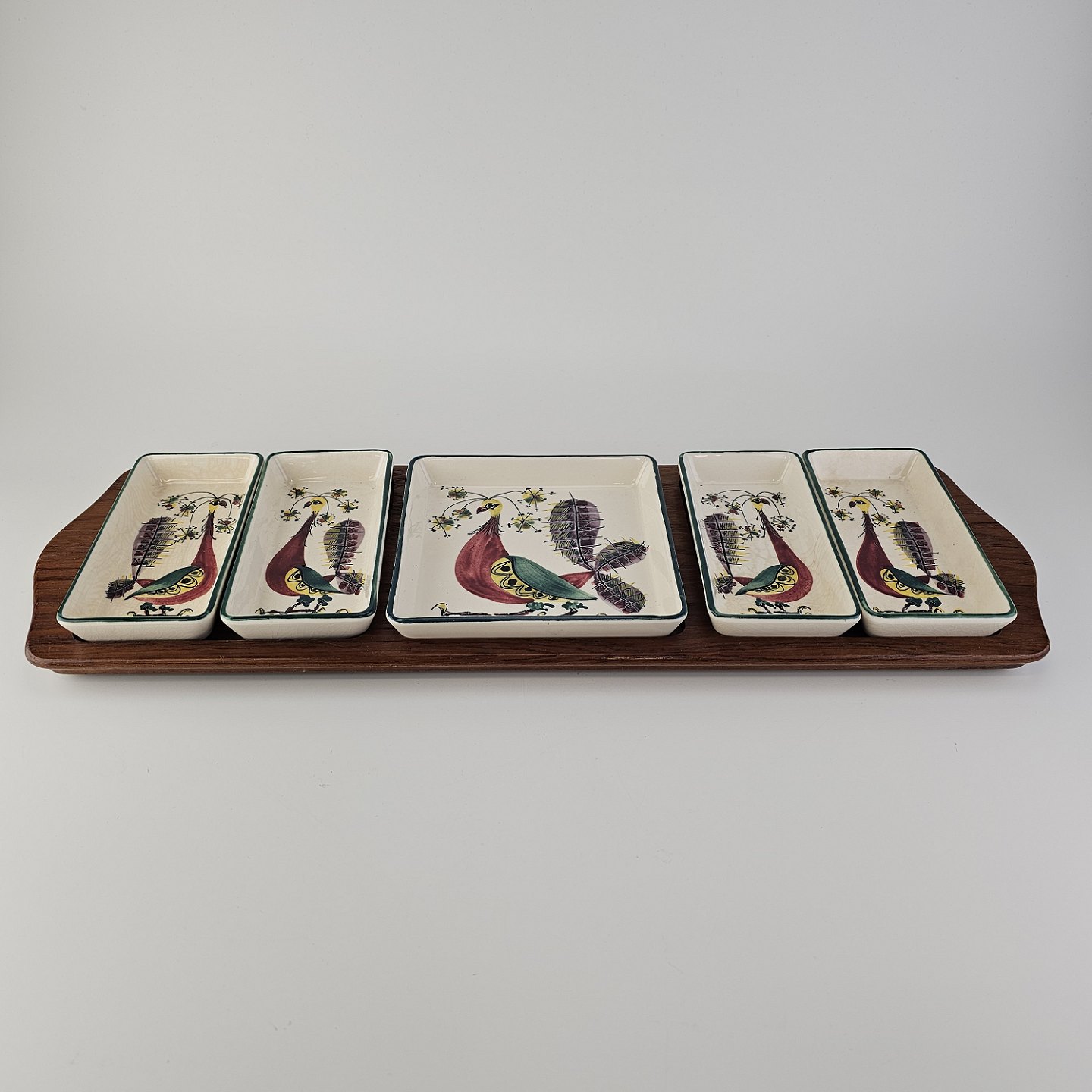 Cabaret fad fra serien Tenera med bakke i teak træ og fem små, firkantede fade i fajance med dekoration af påfugleNr. 112/2193 & 113/2193