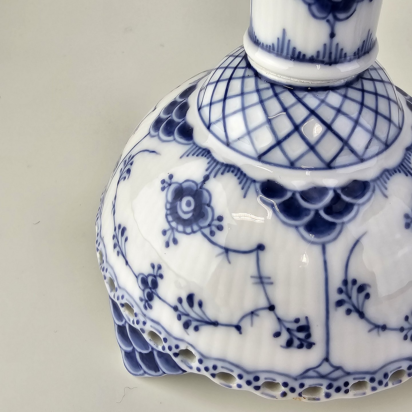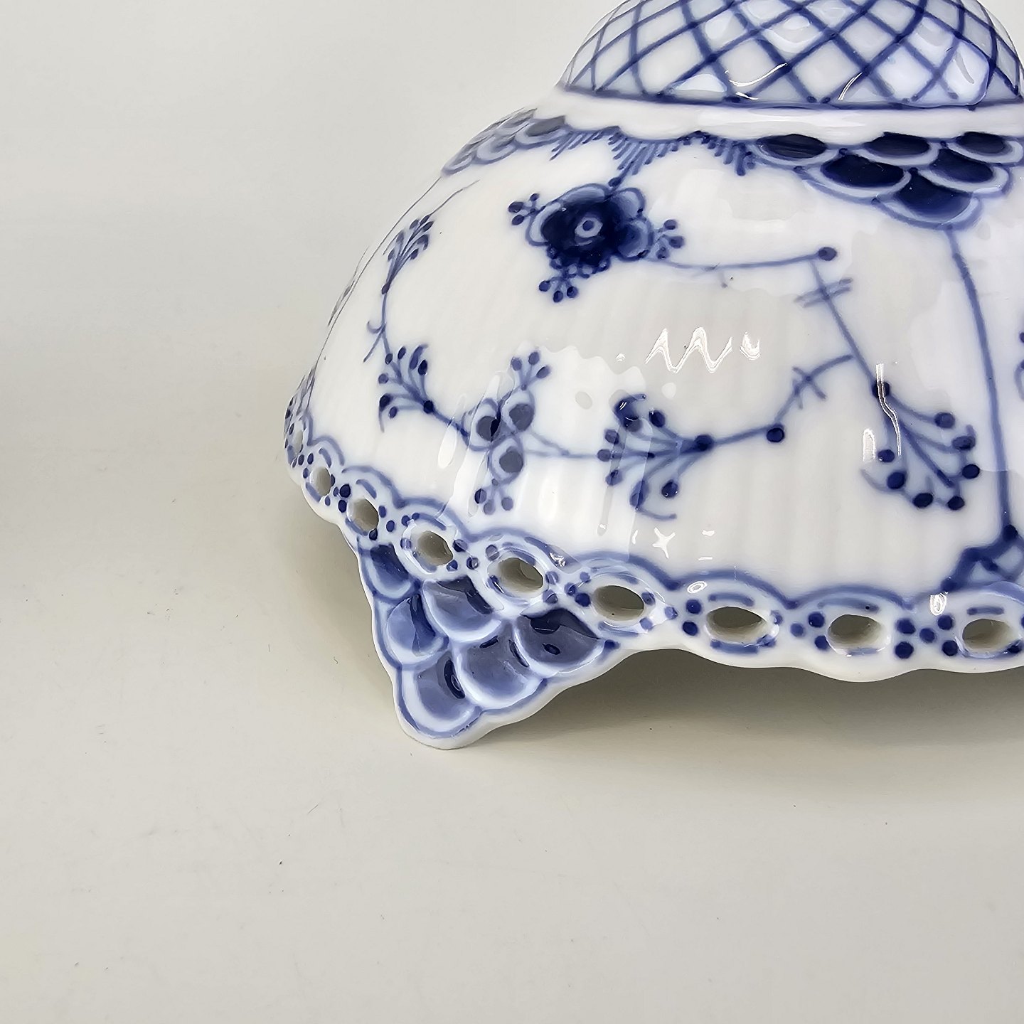 Musselmalet helblonde er riflet hvidt porcelæn med dekoration af blå ranker og en kant med blonder.