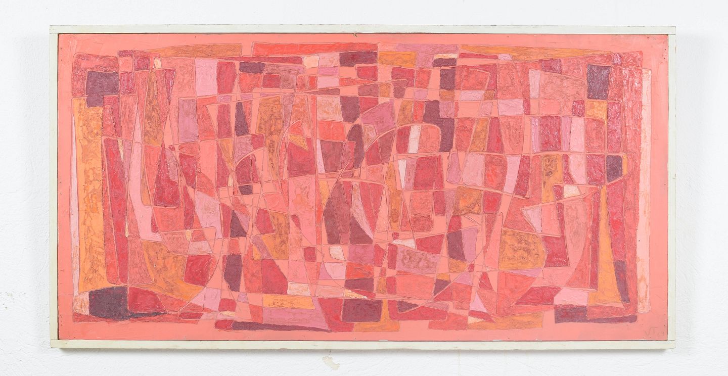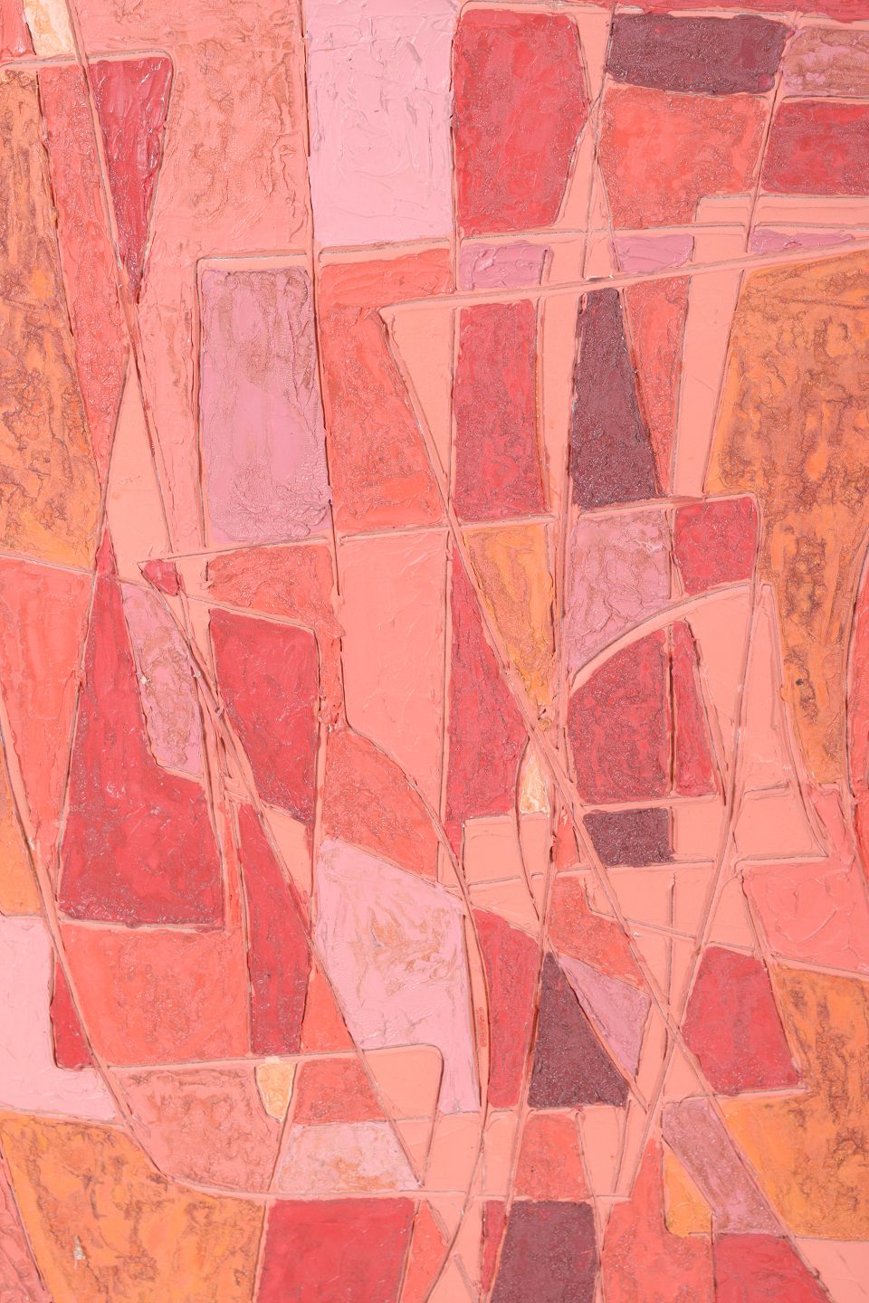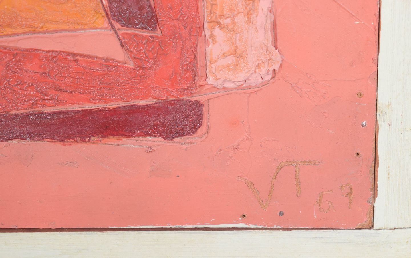 Vita Thymann, oil on board, listed Danish artist.Abstract expressionist composition structured in a mosaic-like arrangement with warm red and pink tonalities, where segmented planes and rhythmic divisions create a dynamic and decorative visual field. Signed VT.