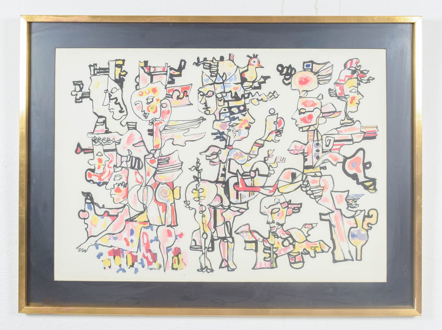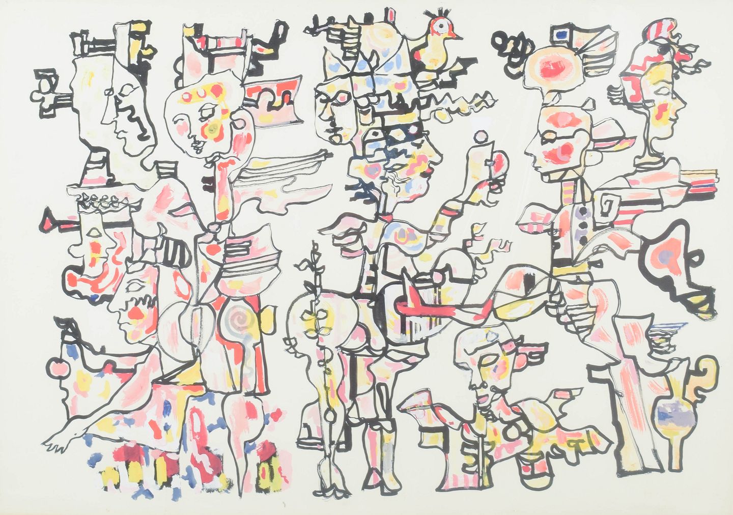 Complex figurative composition featuring stylized and fragmented human figures constructed in a decorative, almost mosaic-like visual language. The work is executed with a characteristic linear structure and fields of color in warm tones. Signed and dated 1970.