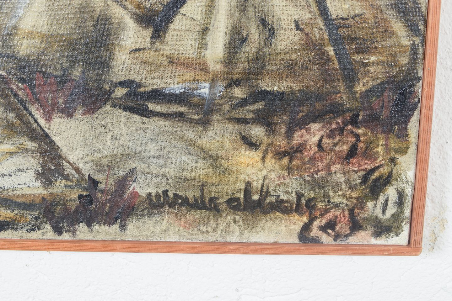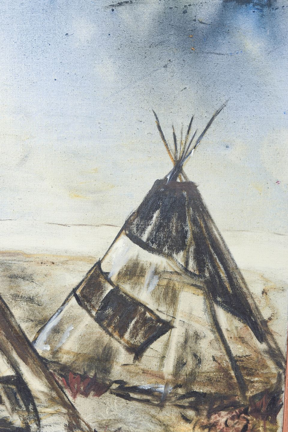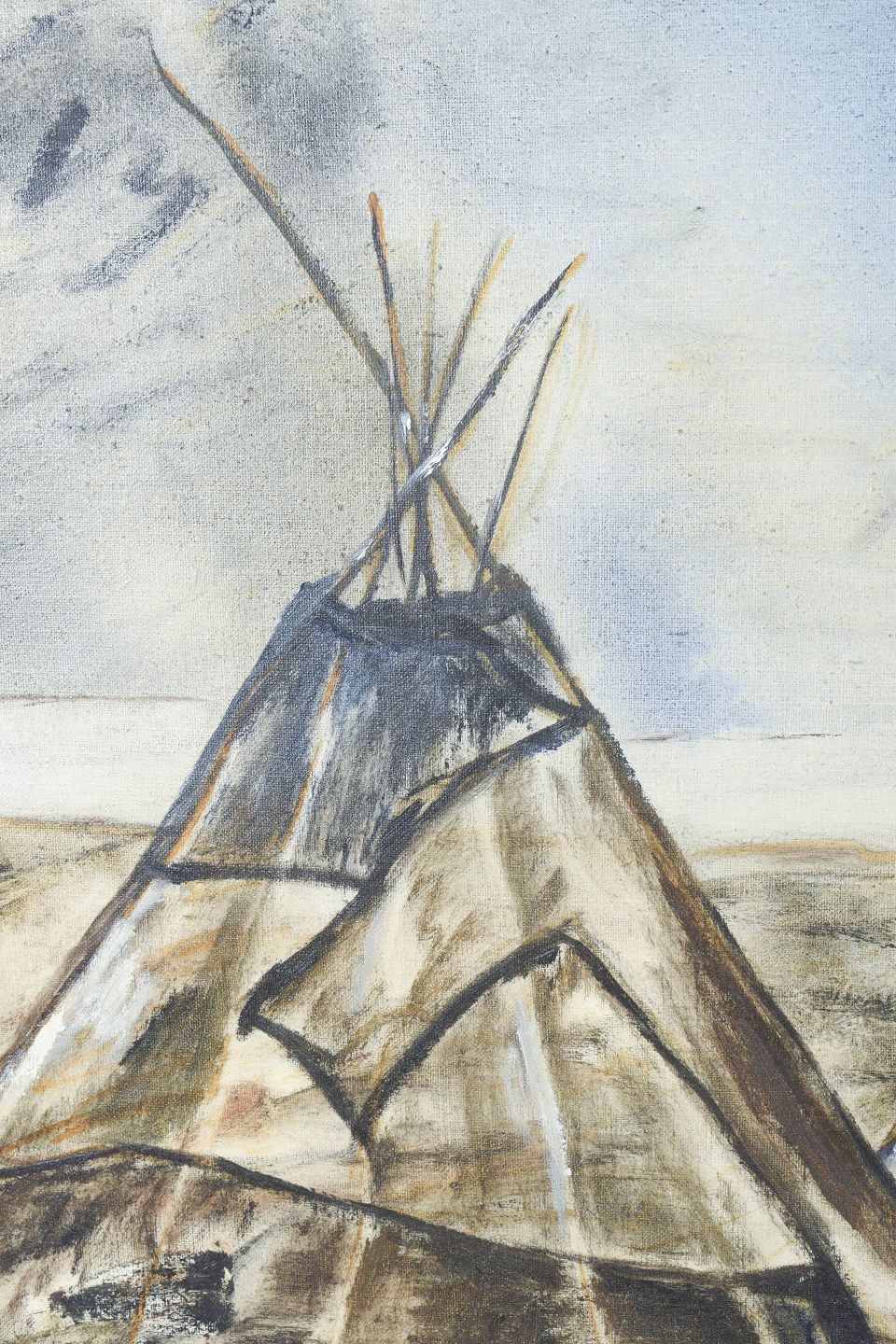 Ursula Ekberg, oil on canvas, listed Swedish visual artist.Modernist landscape motif from Lapland depicting Sámi tents in an expressive and slightly abstracted composition. Executed in subdued earthy tones with a free brushstroke, signed.