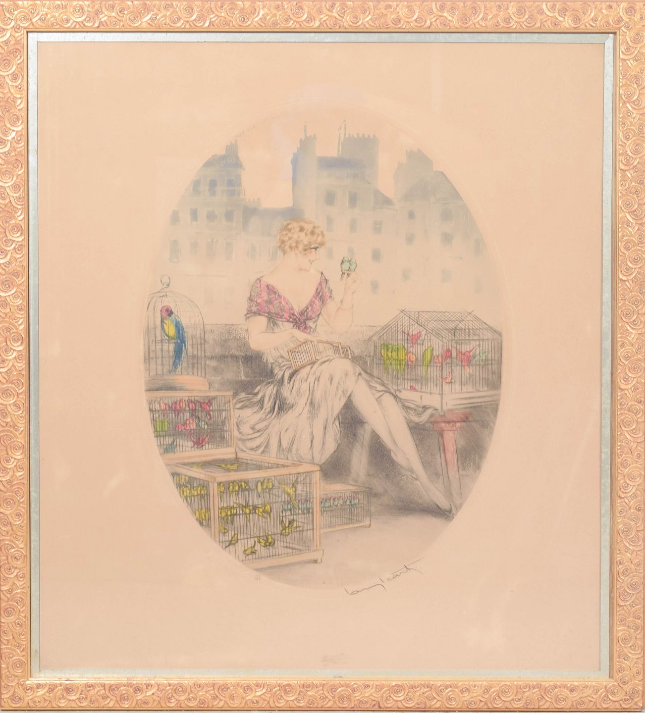 Elegant and decorative composition depicting a seated woman surrounded by birdcages, executed in Icart’s characteristic Art Deco style with refined linework and delicate colouring. Signed in pencil.