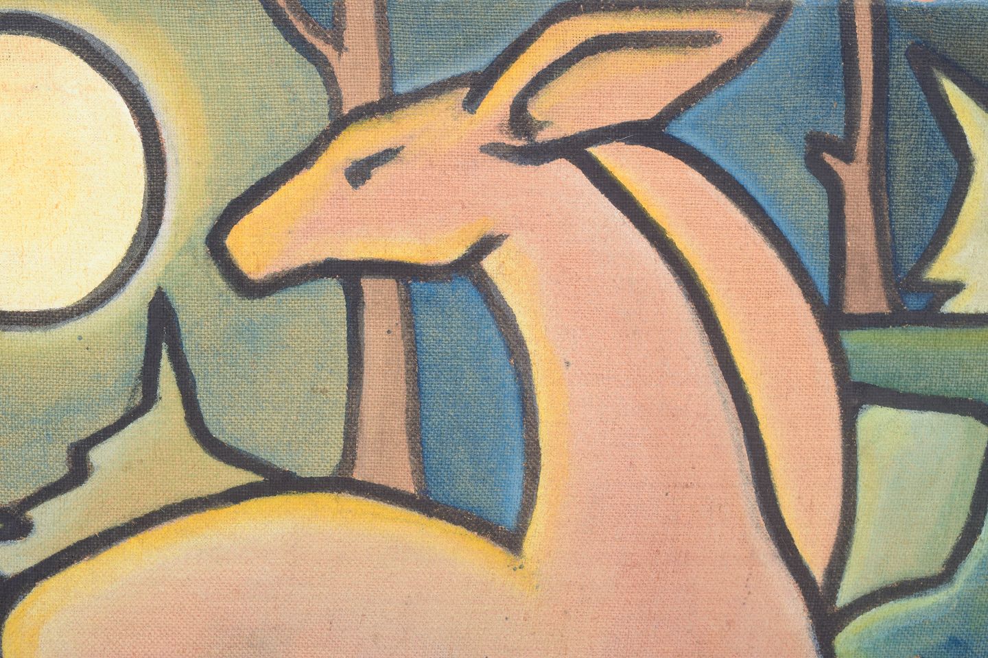 Walter Praski, oil on board, listed Swedish visual artist.Abstract and stylised composition featuring figurative elements in the form of deer-like motifs, executed in a modernist palette with soft transitions and decorative outlines. Signed and dated 1956.