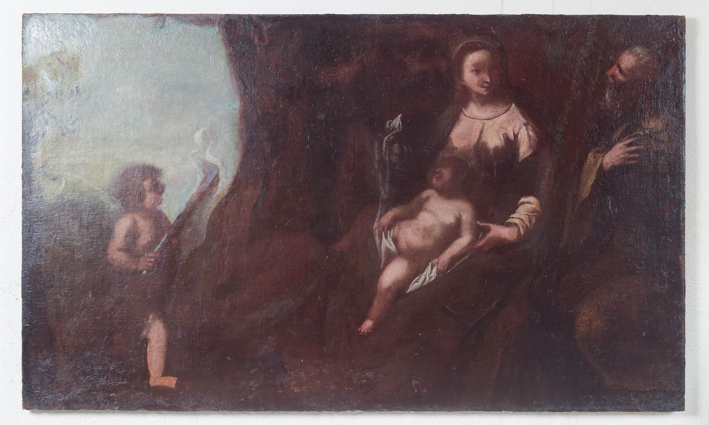 Flemish school, religious subject, old master.Classical religious composition depicting Madonna and Child accompanied by a saintly figure and an angel, rendered in a soft and subdued palette characteristic of the Baroque tradition. Executed in oil on canvas and later professionally restored.