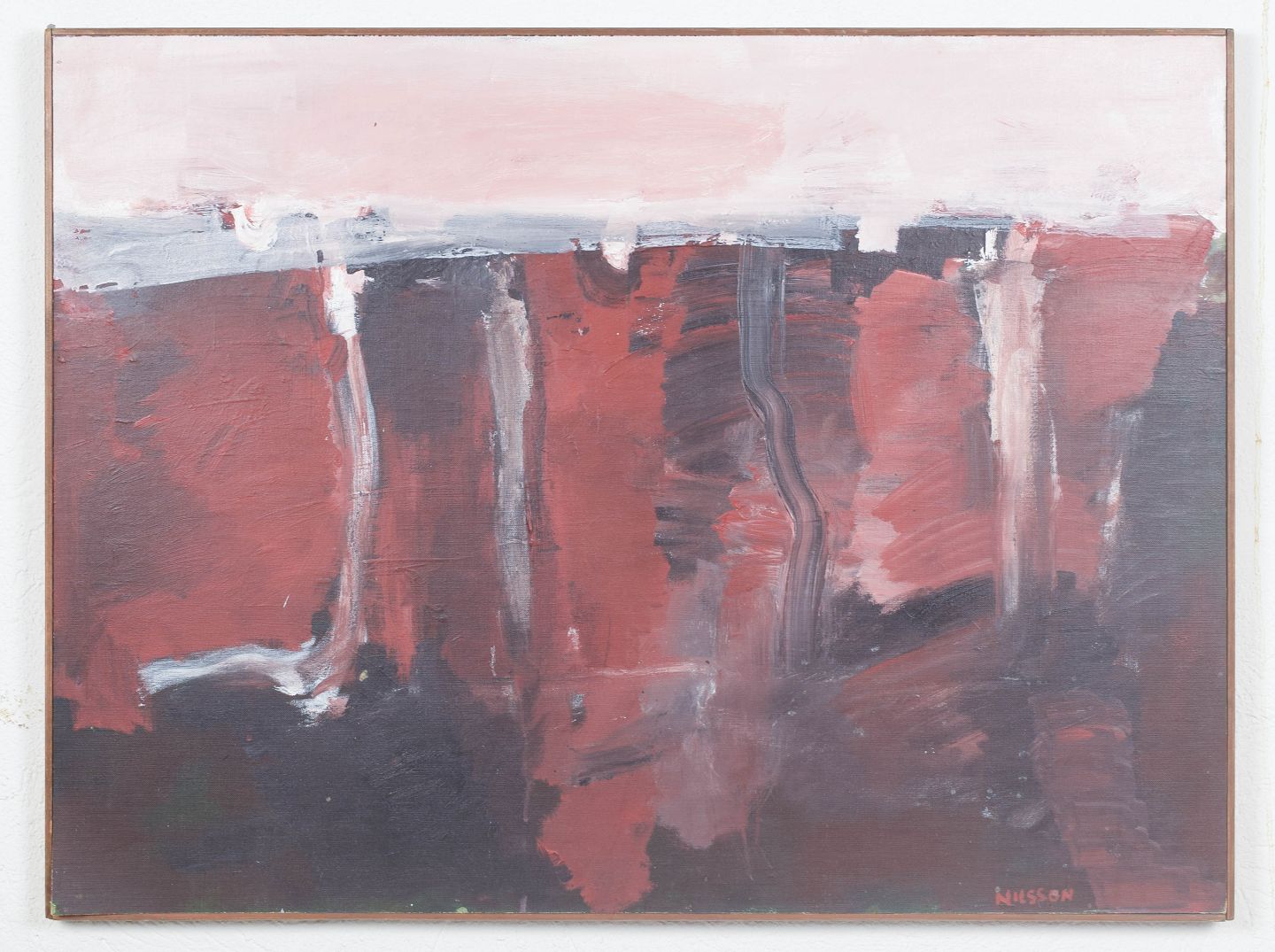 Göran Nilsson, abstract composition, listed Swedish artist.Abstract composition executed in oil on board with expressive brushwork and layered colour fields in muted reddish and grey tones. The composition shows a balanced tension between structure and spontaneity, signed.